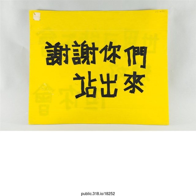1.內容:謝謝你們站出來,世界可能不會變好,但你會2.中研院原件典藏編碼:OE006823.中研院識別號:182524.中研院關係藏品-關聯:5.中研院關係藏品-整體:6.提供者: