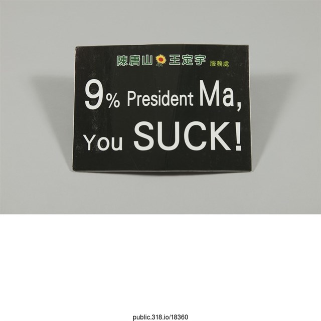 1.內容:退服貿護民主、「陳唐山、王定宇服務處、「9% President Ma, you SUCK!2.中研院原件典藏編碼:OG001393.中研院識別號:183604.中研院關係藏品-關聯:5.中研院關係藏品-整體:6.提供者: