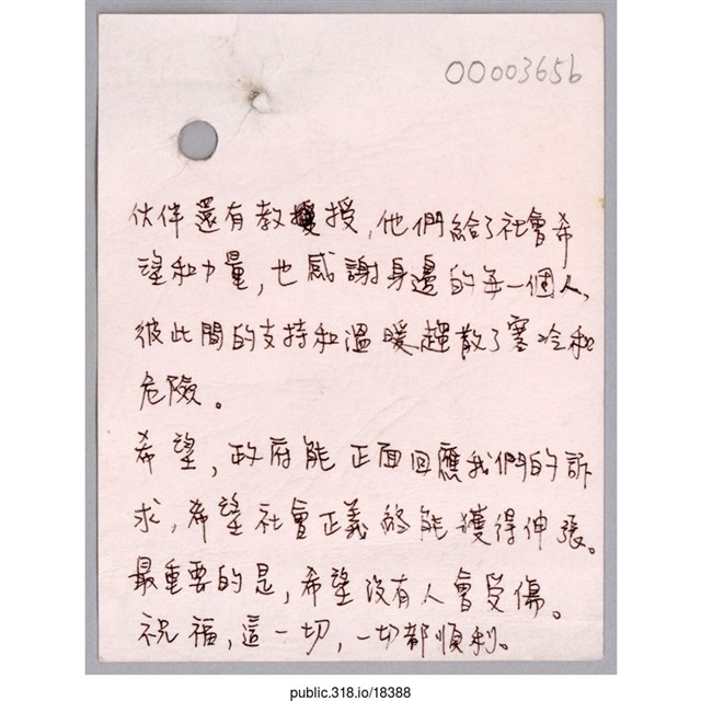 1.內容:看到人民為了同一個目標而自發地聚集,真的很感動\r\n政府強行在30秒內通過服貿,不敢相信這是在現代國家會出現的事,媒體更是令人失望。但是,街頭上人民的理性和堅定,我相信,我們溫柔的堅定會感動更多人,讓愚弄人民的政府認錯並付出代價。感謝現在在議場的先鋒,夥伴還有教授,他們給了社會希望和力量,也感謝身邊的每一個人,彼此間的支持和溫暖驅散了寒冷和危險。\r\n希望,政府能正面回應我們的訴求,希望社會正義中能獲得伸張。最重要的是,希望沒有人會受傷。祝福,這一切,一切都順利。2.中研院原件典藏編碼:O