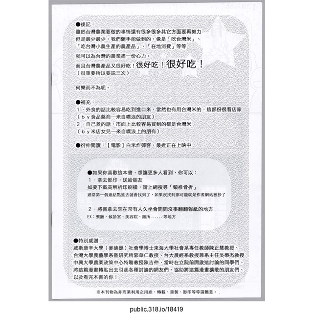 1.內容:消費者如何救台灣農業?\r\n很簡單!\r\n吃飯就對了!上\r\n論服貿協定與自由經濟示範區對台灣農業的可能衝擊。\r\n3月27日晚間。\r\n難得來台北一趟,要不要一起去上公民課啊?\r\n公民課?\r\n阿哈!是那個吧?\r\n沒錯!就是在戶外上課的那個!\r\n好哇!\r\n我早就準備好要在那邊睡一晚囉!\r\n走,立法院。\r\n於是我們就去了立法院現場。\r\n太陽花學運,雖說是「學運」但實際上來參加的人,\r\n約有一半是社會人士。\r\n抱歉,沒有實際數據,只有目測個大概。\r