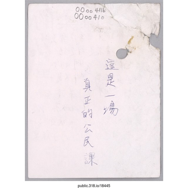 1.內容:我們都知道,只要作弊了,無論警察是對是錯,就是作弊!而我們的政府正在做弊,並非只有北韓、秦朝才稱作暴政,無視民主,無視法律的政府,就是暴政的政府!無論服貿是好是壞,都應該遵照程序逐條審查!2.中研院原件典藏編碼:OO004113.中研院識別號:184454.中研院關係藏品-關聯:5.中研院關係藏品-整體:6.提供者: