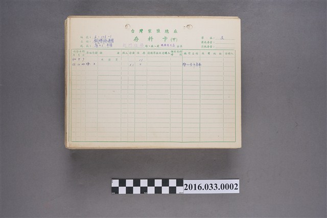 本疊文件共165張資料卡為臺灣製鹽總廠的存料卡,物件內容指涉相關工廠的機具登帳程序,包括維修去處等歷程資料,機具管理為總帳制,亦即由總公司統籌,不歸各單位辦理,所以哪怕是一條鍊條,一顆齒輪都需要有甲、乙式登帳謄錄的管理方式,當然這是在電腦資訊化之前的管理方式。 從存料卡上的日期、代號或可想像一個料件從購入、使用到維修重新投入生產的完成序列,也是見證前人管理智慧的重要憑證。