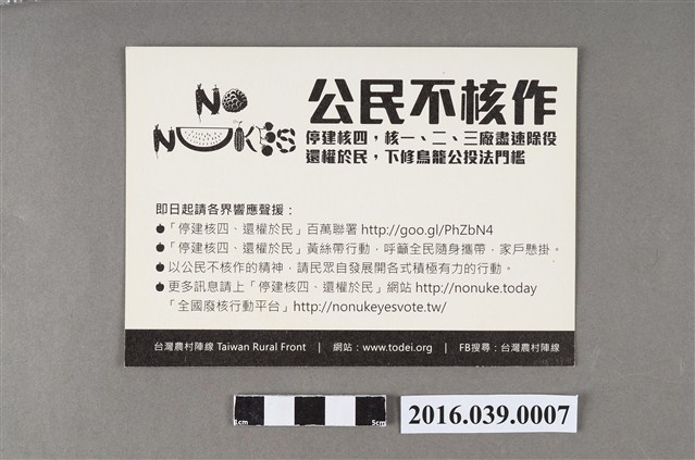 此為臺灣農村陣線所發行廢核宣傳品,約為ㄧ般明信片大小的宣傳小物,正面底為黑色,上有黃色的「廢核」字,並且字體皆是用動植物所構成的藝術字體,右上腳有「臺灣農村陣線 Taiwan Rural Front」。背面則是關於廢核的相關描述與網址,如大標為「公民不核作」,內容為「停建核四,核一、二、三廠盡速除役還權於民,下修鳥籠公投法門檻」。台灣農村陣線簡稱農陣,其成員有台灣農村的農民、農村工作者、NGO、媒體工作者、學者、作家、法律專家、工程師、藝術家、學生等,其秉持著「小農經濟」、「永續農業」、「糧食主權」的理念,在網路發起農村議題的串聯行動,並藉著媒體持續與台灣社會展開的對話。