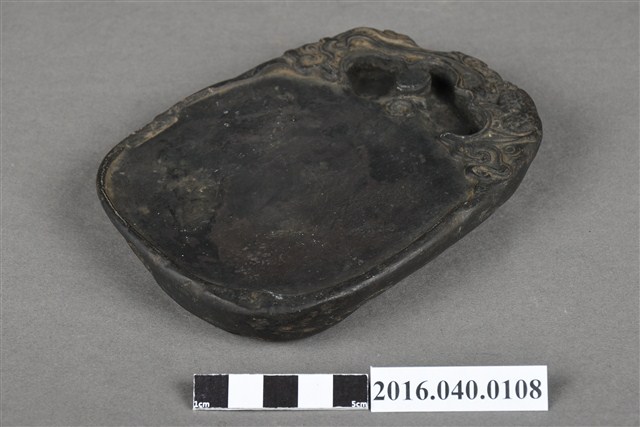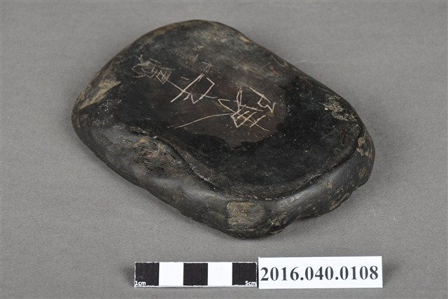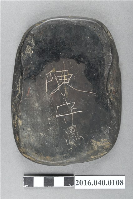 陳澄波文物。背面刻有「陳守愚」三字,陳守愚為陳澄波父親,1909年過世。據陳家人初步研判硯台應不是陳守愚所刻,應為註記硯台所有人是陳澄波父親。