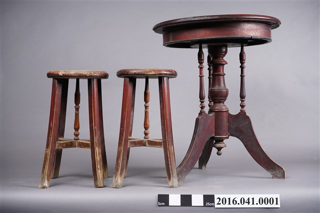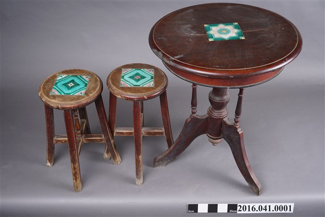 1. 鑲彩色磁磚寢室桌椅組,包括小圓桌及2只無靠背高腳椅,共1組3件。此桌椅組為捐贈者曾祖父施性恒於日本時代建造臺南市西區長樂街110號(現為中西區民權路)老家時,聘請唐山師父到家製作全套家具,本件與第1批捐贈之鑲大理石紅眠床(登錄號:2015.029.0001)為同時期製作之家具,使用者為捐贈者祖父母施榮霖先生與施黃錦女士。原放置於2樓主臥室紅眠床前,作為主人夫妻倆臥室內喝茶、聊天等休憩用之茶几,造型十分優美。