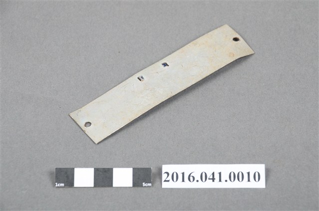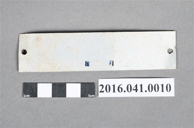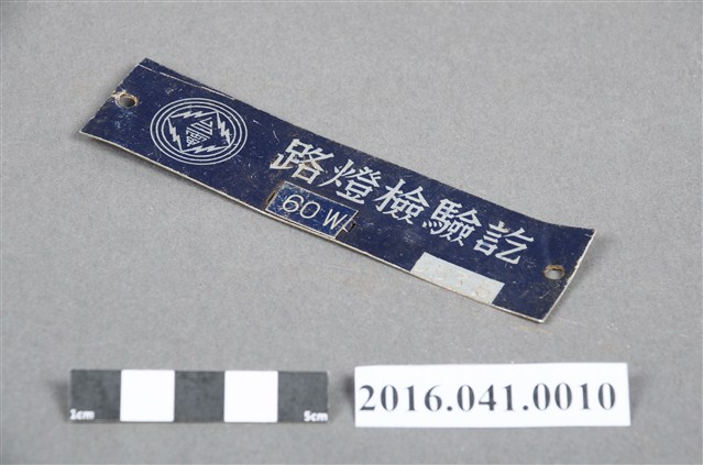 本件為捐贈者民權路3段老家後門的舊路燈檢驗牌,原釘在後門門框上,因老家後門屬違建,捐贈者表示該只路燈早已不復存在,故拆除後門前取下。路燈號碼牌為鋁合金印刷為藍底白色字:「臺電 路燈檢驗訖 60W 0535」,左右兩側邊各有1個小釘孔,背面無任何塗漆。