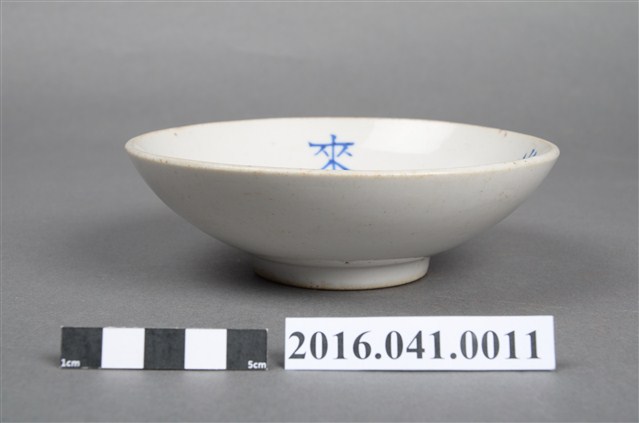 本件為捐贈者民權路3段老家所使用的白瓷碗,碗內有手寫藍色「來興食堂 電話九八四」等9字。碗底部有一小圈足,足底無上釉。