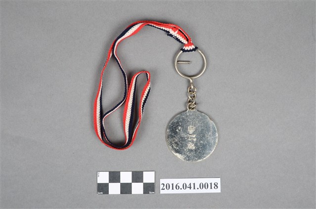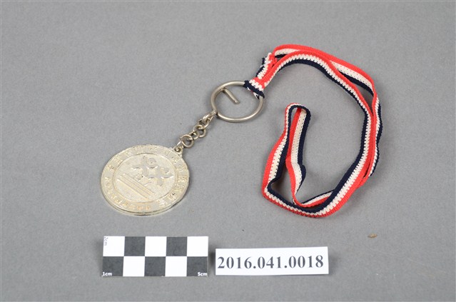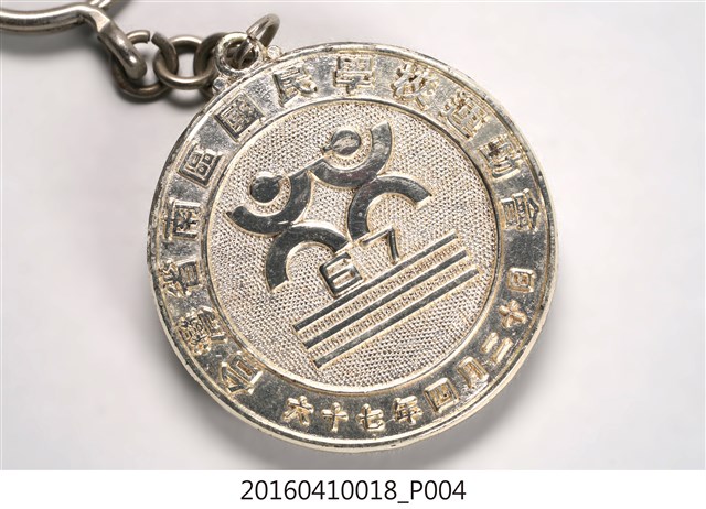 本件為捐贈者父親施克洲先生大學時期參加網球比賽獲得之銀牌獎章。鍍銀獎牌綁縛紅白藍三色掛帶。獎牌正面鑄印「臺灣省南區國民學校運動會 六十七年四月二十」字樣,中央有雙人圖形及「67」數字,被免責刻印「第二名」3字。