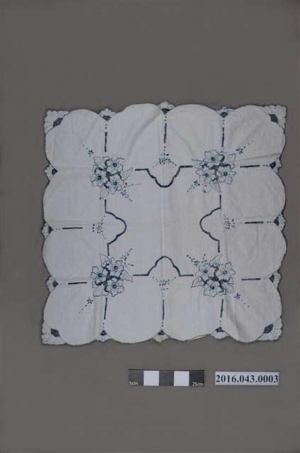 本件為捐贈者母親邱林水金約民國46(1957)年於台南電繡補習班學習電繡時之練習作品。白色棉質方巾,其上應用電動縫紉機進行32種電繡繡法圖紋,四邊亦進行2種滾邊練習。