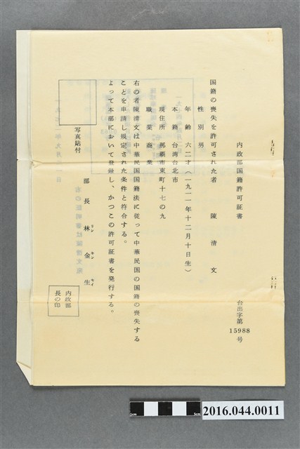 本多輝雄律師為改名為田川清之陳清文先生提出謙茂茶行商標變更之申請書,主要變更項目所有人姓名,因陳清文先生在1973年9月正式由中華民國籍歸化為日本籍,因此姓名也由陳清文改為田川清,申請書除了有日本政府規定之所有人變更申請書外,亦有中華民國內政部發給的喪失證明書國籍。