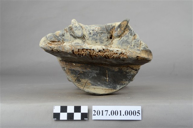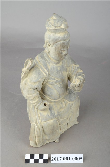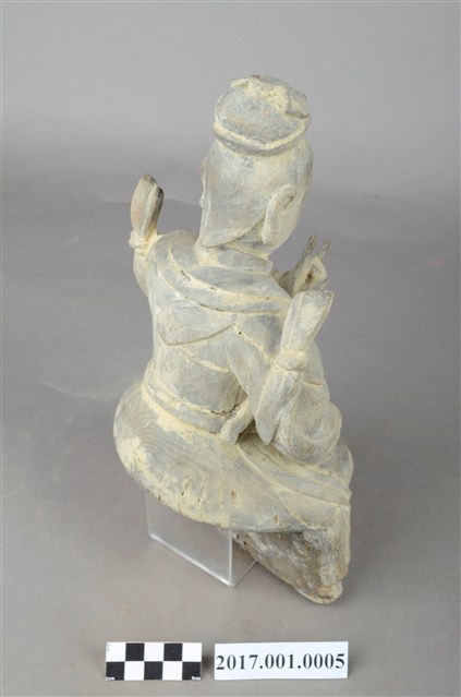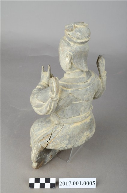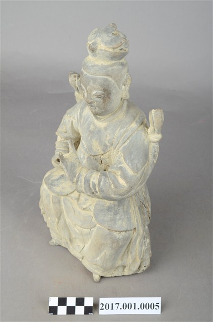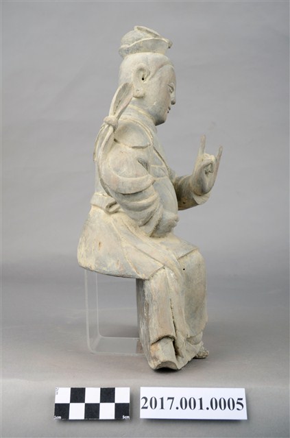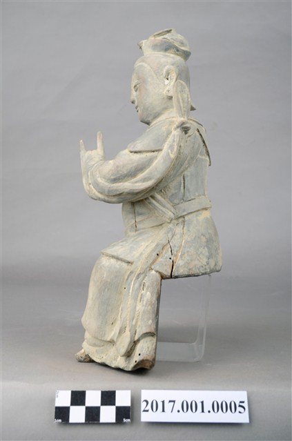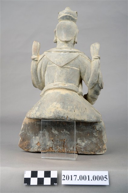 1.本件木雕九天玄女像,作坐姿姿態,表面粧佛已褪去,背面開有方形入神洞,封榫尚存。頭戴禽鳥造形頭冠,顏面表現雙目半睜,上半身肩披雲肩,腰部繫束腰固定護腹,寬袖的袖擺打結且因擺動而向後揚起,下半身著裙,腳穿弓鞋。端坐,左手橫置於胸前,左手掌朝上結劍指,右手握拳持物置於右腿上,持物已失。本件屬於「脫椅」作法,臺座已失。本件推測為九天玄女是依據禽鳥造形的頭冠,是為呼應九天玄女源自玄鳥的典故。