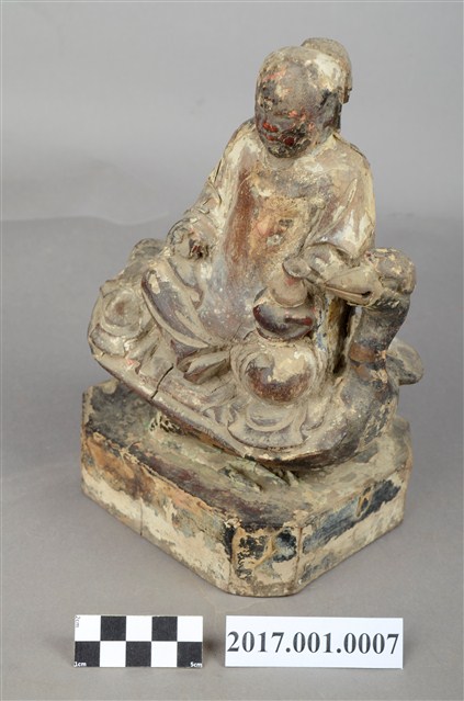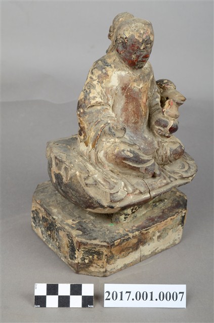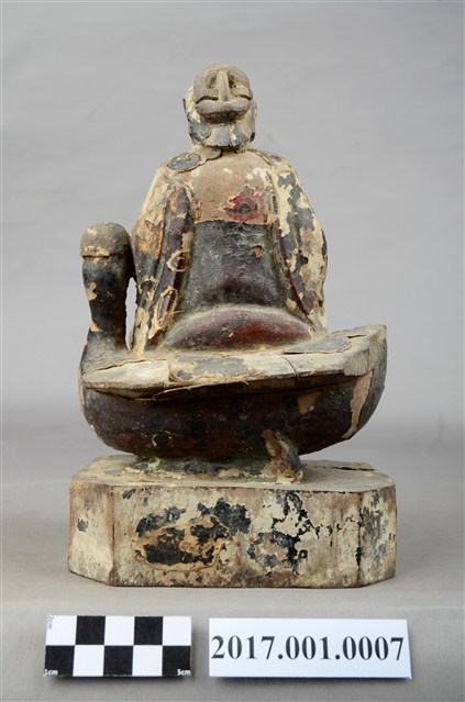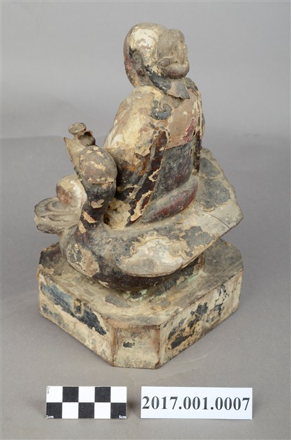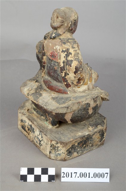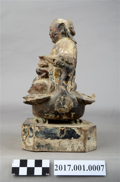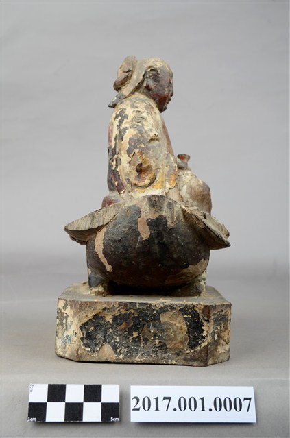 1.本件木雕九天玄女像,作坐姿姿態,表面採用塗裝、安金不見紅粉線盤飾粧佛技法,粧佛剝落。盤髮、髮髻結於腦後,顏面表現雙目半睜,收下顎,上半身著長袍,下半身著長褲,雙腳套鞋,坐於禽鳥坐騎上。雙足盤腿,左手捧一葫蘆置於左腿上,右手翻掌置於右腿上。禽鳥應為玄鳥,呼應九天玄女的典故,玄鳥頭在左側,禽鳥坐於臺座上,臺座無雕刻、裝飾。