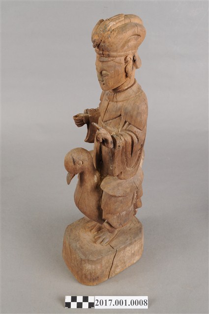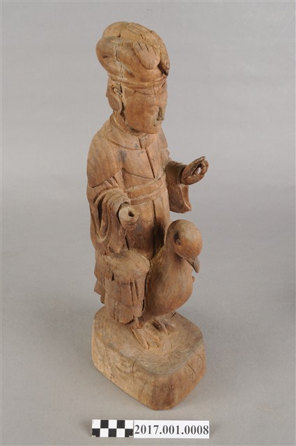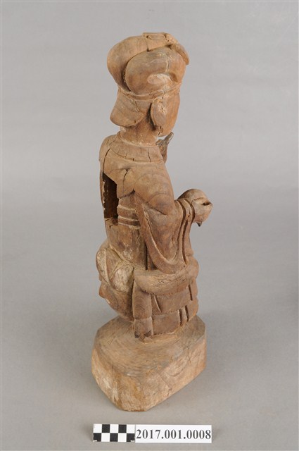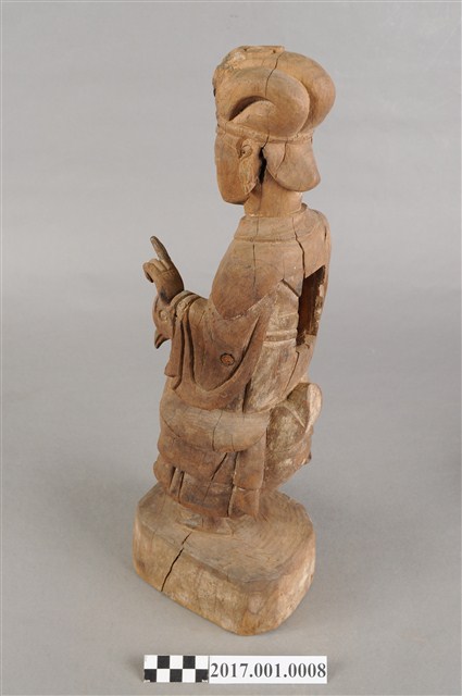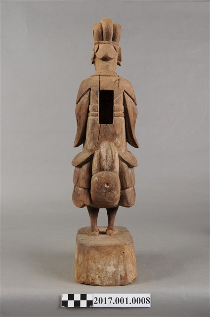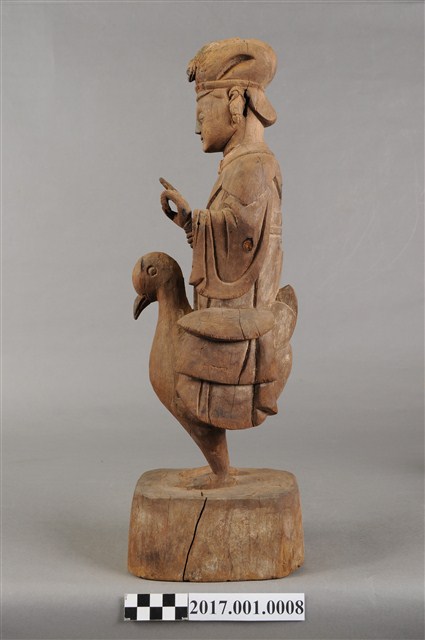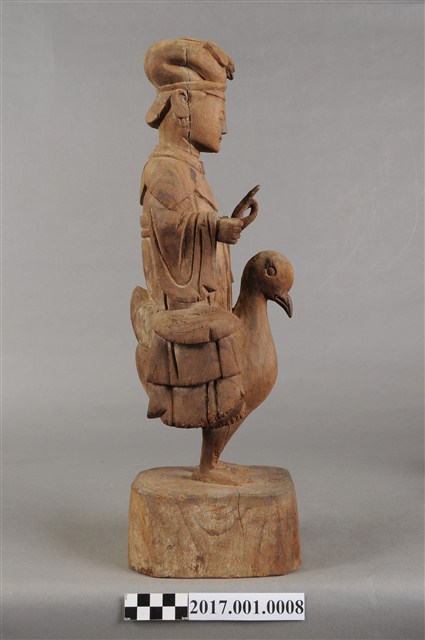 1.本件木雕九天玄女像,作騎鳥姿態,表面粧佛已褪去,背面開有長方形入神洞,內容物件已取出。玄女盤髮。頭戴禽鳥造形頭冠,顏面表現雙目半睜,抿嘴微笑,雙耳耳垂佩戴耳環,肩披雲肩,上半身著寬袖盤領衣,下半身著裙,裙裳上端繫於胸下,雙腳套鞋,坐於禽鳥坐騎上。跨坐,左手前舉,手掌朝上,結劍指訣,右手握拳持物,持物已失。禽鳥應為玄鳥,呼應九天玄女的典故,禽鳥兩足四爪站於臺座上。臺座無雕刻、裝飾。本件推測為九天玄女是依據禽鳥造形的頭冠,是為呼應九天玄女源自玄鳥的典故。