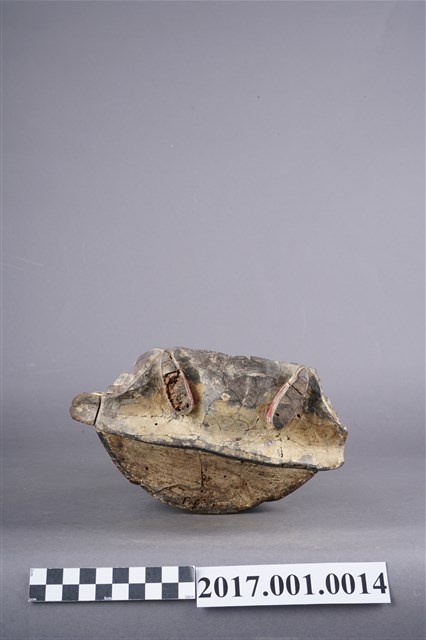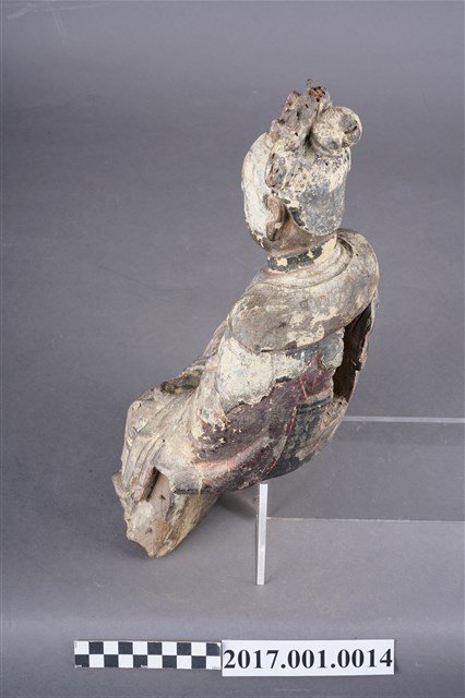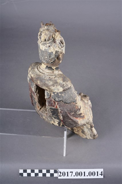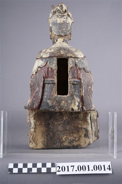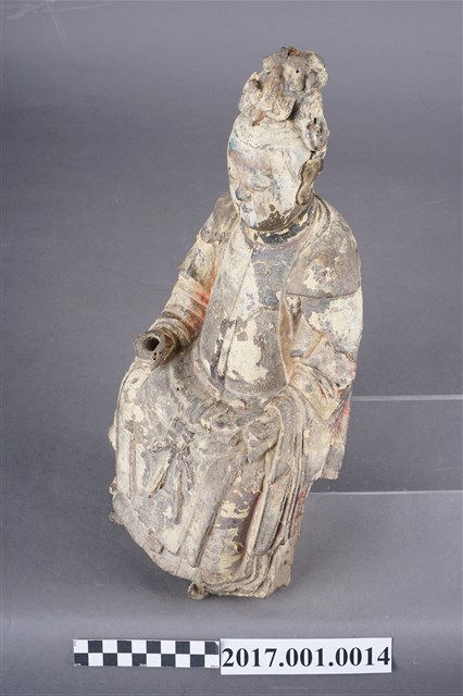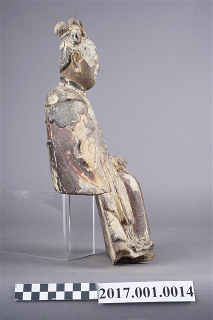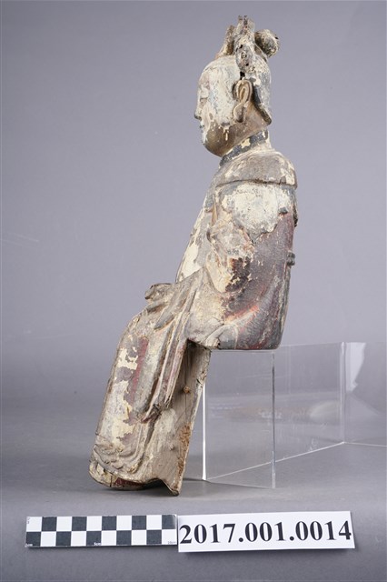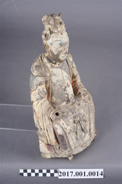 1.本件木雕九天玄女像,作坐姿姿態,表面施作塗裝、漆線盤飾粧佛技法,粧佛局部剝落,背部開有長方形入神洞,封榫佚失,內容物件已取出。髮梳高髻,佩戴鳳簪,顏面表現雙目半睜,上半身著盤領衣,肩披雲肩,腰繫玉帶,腳穿鞋,雲肩、袍服漆線盤飾捲草紋。端坐,左手翻掌,以拇指按中指與無名指,作道指訣,置於左膝上,右手握拳持物置於右腿上,持物已失。本件屬於「脫椅」作法,臺座已失。