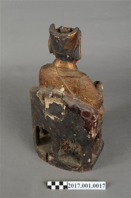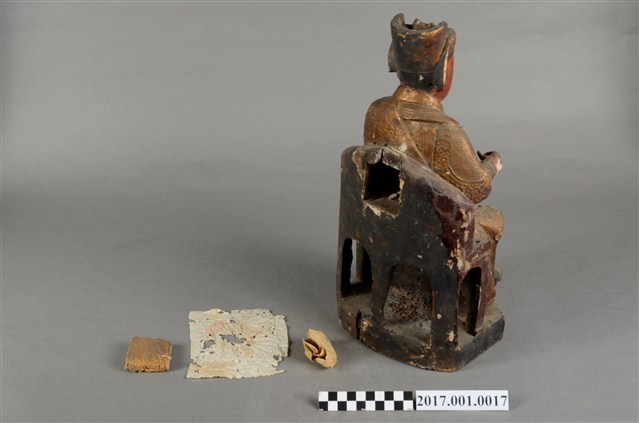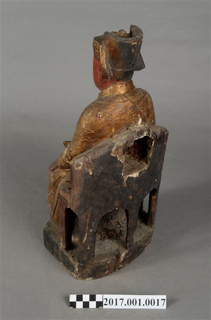 1.本件木雕二郎神像,採坐姿姿態,表面施作塗裝、安金不見紅粉線盤飾粧佛技法,粧佛局部剝落,背面開有方形入神洞,封榫尚存。顏面表現青年男性相貌,朱紅臉色,雙目睜眼,額頭另有一眼。頭戴幞頭,身作「衷甲」式的裝束,身著鎧甲,外套著蟒袍,在右肩、右腳處露出鎧甲,肚腹圓凸,腹上束看帶,腳穿皂靴,坐於圈背椅上,蟒袍以粉線盤飾蟒紋、雲紋等紋飾。挺身端坐,雙足垂下,左手掌放於左腿上,右手握拳舉起。圈背椅的扶手出頭脫落遺失,椅前放置踏几。臺座底部有蛀蝕的情形。