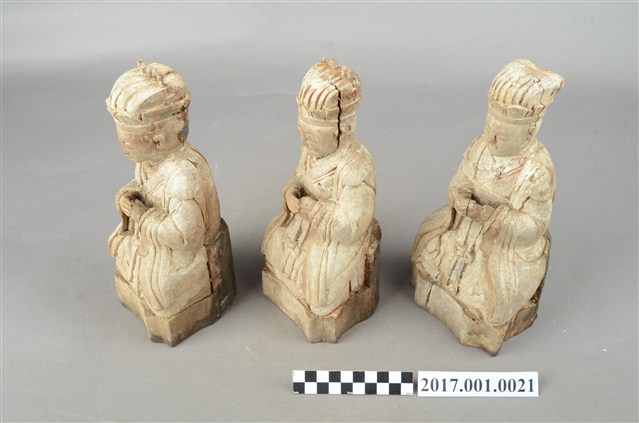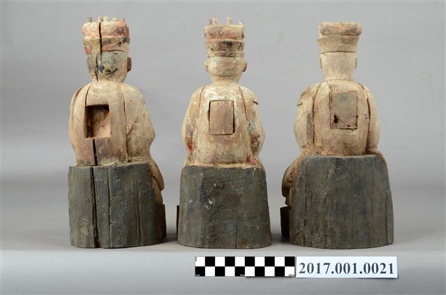 1.本組木雕三官大帝像為三像一組,採坐姿造形,粧佛已褪去,背後有長方形入神洞,天官、地官封榫尚存,水官封榫佚失,可見裡面紙張摺疊入神物。三官大帝皆坐於無背的臺座,臺座背後呈方圓形,底部平整,前端略呈梯形,天官居中,地官居天官之左,水官居天官之右。三官大帝臉呈圓形,相貌莊嚴斯文,頭戴通天冠,冠頂有幾個凸點裝飾,身著斜襟寬袖袍服,外罩披肩,裙裳頂端繫於胸前,中央有綬帶打蝴蝶結垂於裳襬下緣。雙手交握於胸前,右手在前,作持笏狀,天官和水官笏板佚失。腳著朝鞋,踏於臺座上。