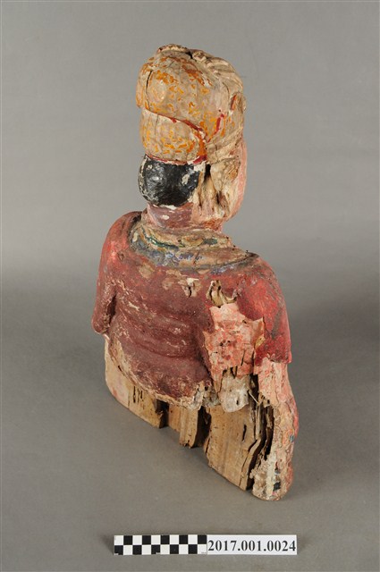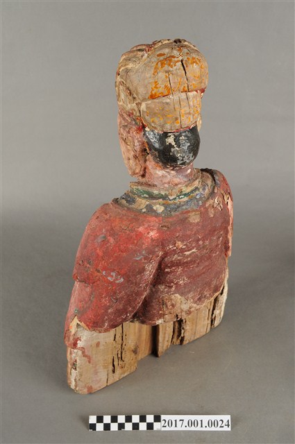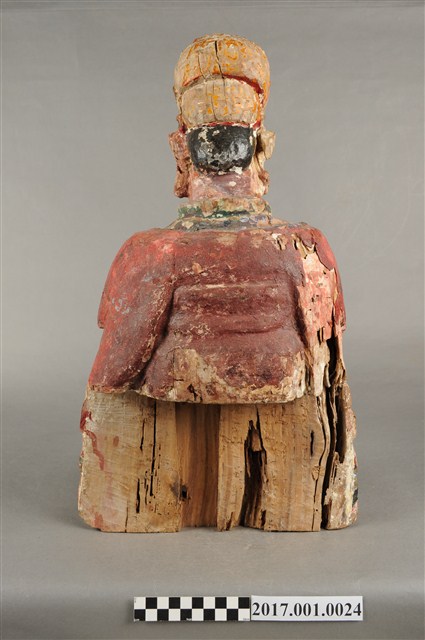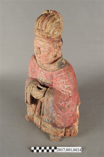 1.本件木雕天官大帝像,採坐姿姿態,臺座已失,外表有紅、綠彩繪粧佛,漆面部分脫落,右側腰部以下局部缺損。天官大帝端坐,臀下呈倒L字形,得另加支撐點,臉呈方圓形,相貌莊嚴,眼皮浮凸臉上畫有幾撇黑鬚,安裝的鬍子已脫落,露出安裝鬍子之洞。頭戴通天冠,身著圓領寬袖紅色袍服,外罩披肩,袍服上有圖紋裝飾,胸前掛有綠色「方心曲領」,雙手交握於胸前,右手在前,作持笏狀,笏板佚失,右手掌與寬袖間有縱裂紋。腳著朝鞋,雕刻身形較短,相貌帶拙趣。
