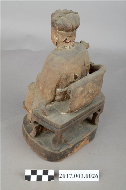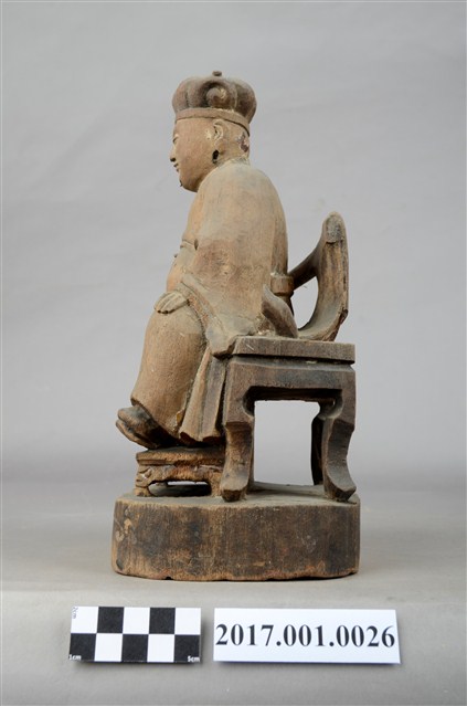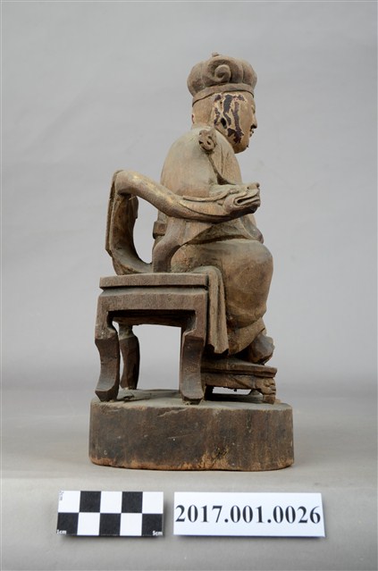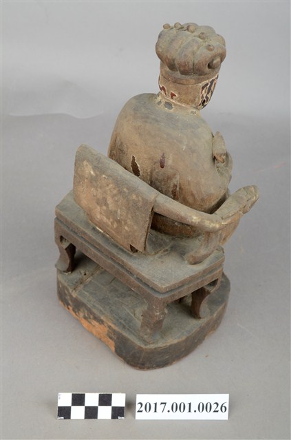 1.本件木雕天官大帝像採坐姿,端坐於圈背椅上,粧佛已褪去,左側扶手缺損。天官像作中年男子相貌,面容祥和,雙眼垂視,臉部鬍鬚已脫落,僅留鬍洞,頭戴梁冠,身著圓領素樸袍服,胸有看帶,腰束腰帶。左手扶於於左膝上,右手小臂上舉,持一柄如意靠於上臂,如意下端磨損。腳著官鞋,右腳微側,椅下有雙層臺座,上小下大,上層為踏几,下層為方圓形臺座,雙足踏於座前方形小踏几,踏几雕有獅吞几腳。