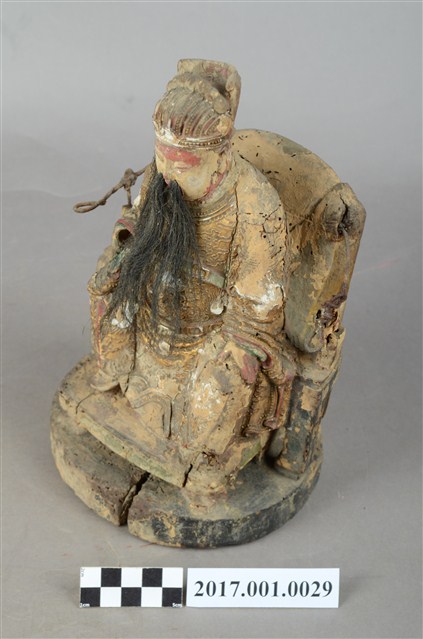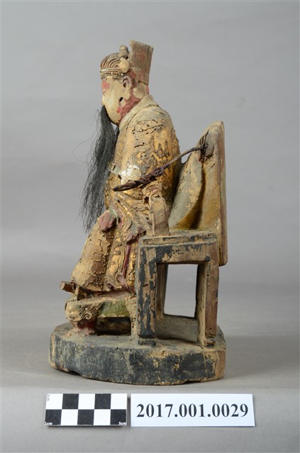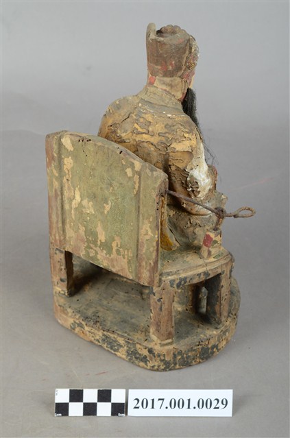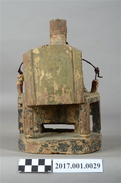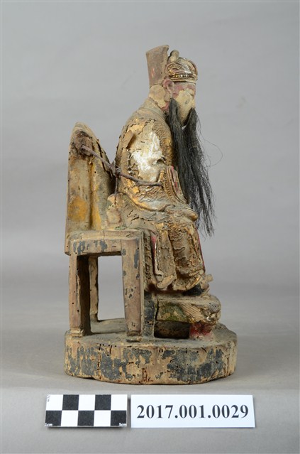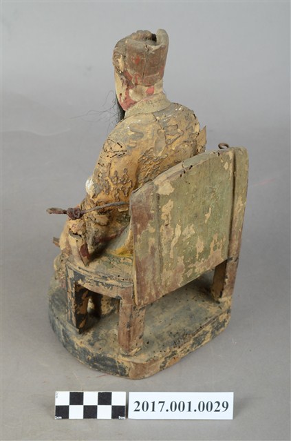 1.本件木雕天官大帝像,採坐姿造形,上有安金,外表有精細漆線與局部粉線粧佛。天官端坐於圈背椅上,臺座呈圓形,底部平整,有一道小裂紋。臉呈橢圓形,相貌莊嚴斯文,留黑色五柳長髯,頭戴通天冠,冠前有圖紋裝飾。身著圓領寬袖袍服,胸有看帶,腰束腰帶,腹前有蟒形漆線粧佛。左手安放於左膝上,右手手肘彎曲,平舉於右胸側,手掌缺損。腳著朝鞋,右腳微側,踏於方形踏几上,几腳作獅吞,几身與兩邊几腳中間有縱裂紋。