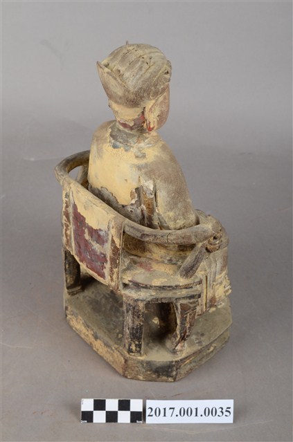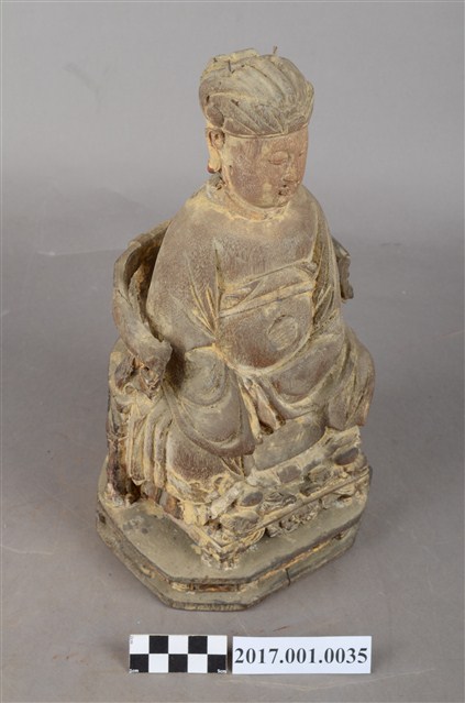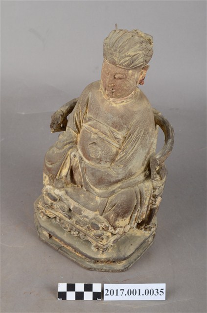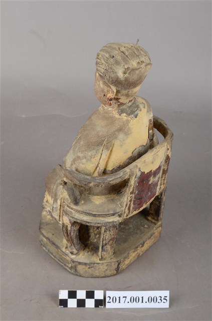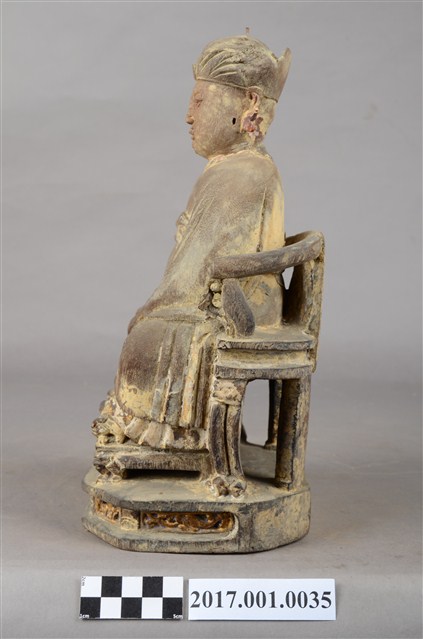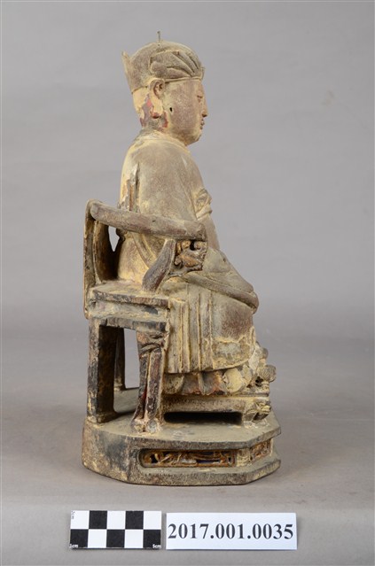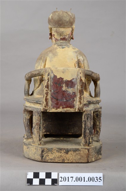 1.本件木雕地官大帝像採坐姿,粧佛已褪去,端坐於圈背椅上,椅下鏤空,腹前中央有一圓形入神洞,封榫尚存。地官臉形方圓,相貌莊嚴,雙眼垂視,鬍子已脫落,露出安裝鬍子之洞口。身著圓領寬袖袍服,雙手相接,以左手握右手於右腰側,是為抱袖(壽)體,手掌隱於袖內,胸前有看帶,腰束玉帶,腹部開入神洞,異於一般常見將入神洞安於背後。腳著朝鞋,雙腳踩於雙獅上,底下有雙層踏几,上窄下寬,上層踏几雕有漂亮的獅吞几腳,臺座則有雕花。