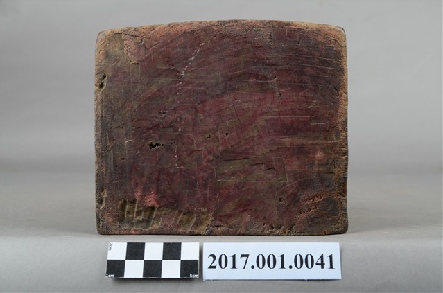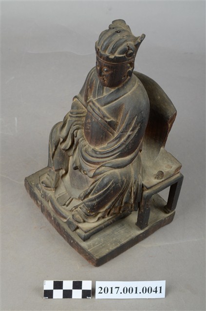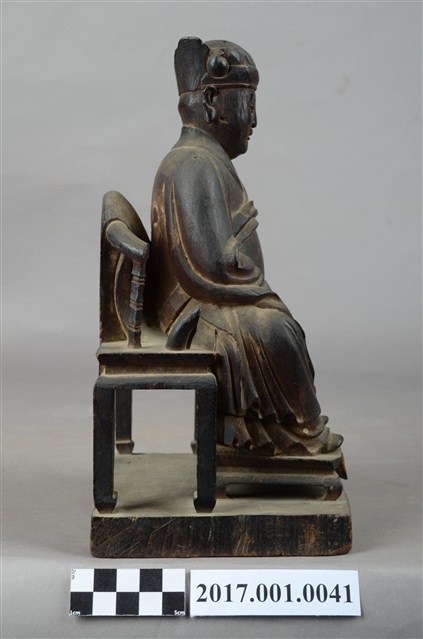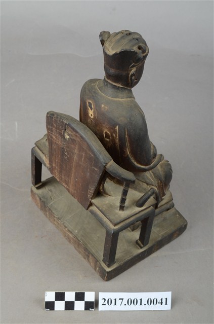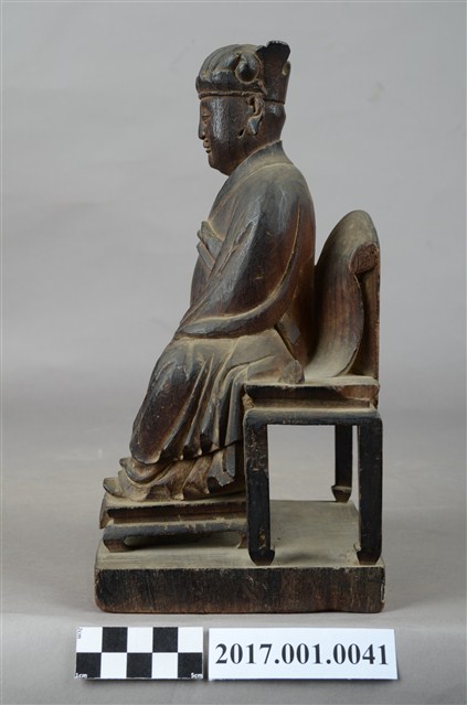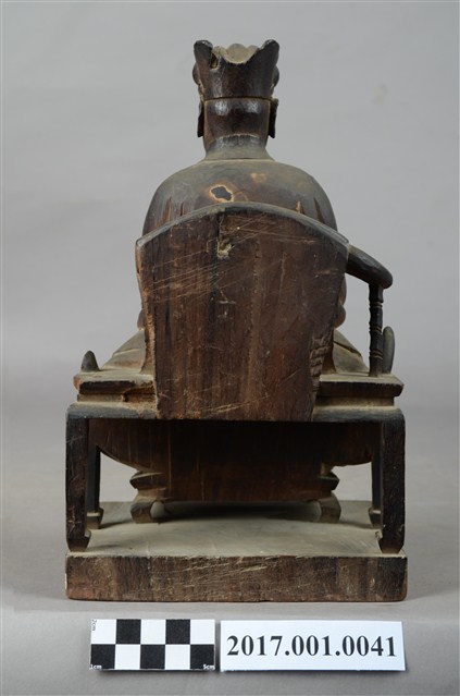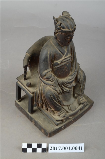 1.本件木雕水官大帝像,採坐姿造形,粧佛已褪去,露出底色木紋。水官大帝端坐於圈背椅上,兩側扶手缺損,左側缺損較多。臉呈方圓形,相貌斯文莊嚴,眉目清晰。頭戴通天冠,身著斜襟寬袖袍服,胸有看帶,腰束腰帶,裡面裳襬中央垂有蔽膝。右手握住左手,交握於右腰側,呈抱袖(壽)狀,手掌藏於衣袖內,僅露出右手拇指。腳著朝鞋,底下有兩層方形臺座,呈上小下大,上層為方形踏几,雙腳踩於踏几上。
