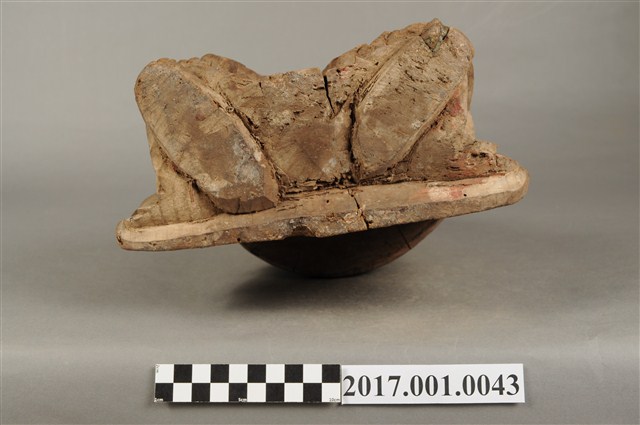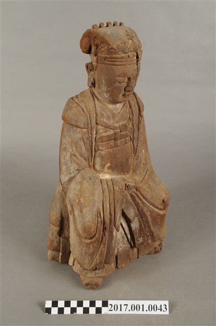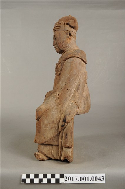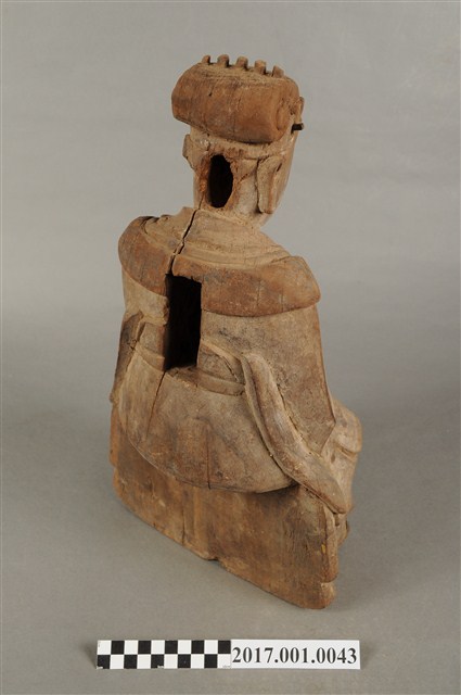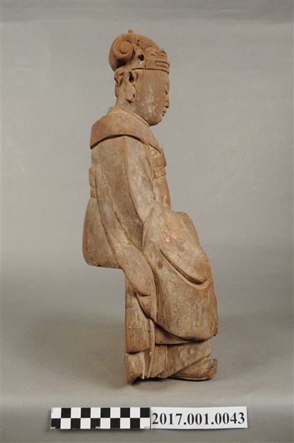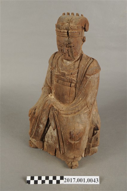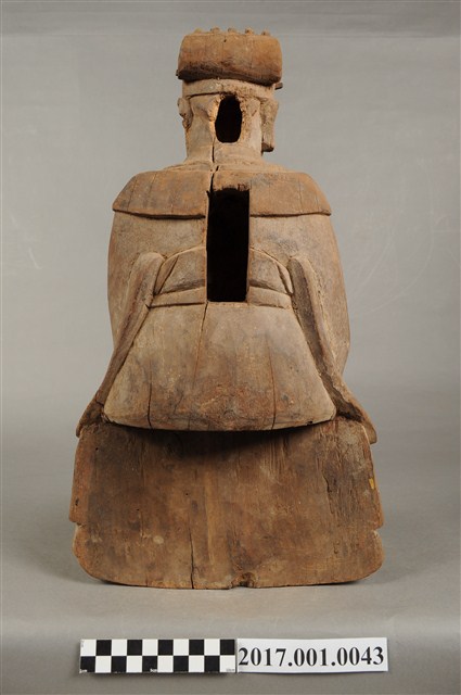 1.本件木雕水官大帝像,採坐姿造形,臺座佚失,粧佛已除去,露出底色木紋,後腦有一橢圓形入神洞,後背另有一長方形入神洞,封榫皆佚失。水官大帝端坐,臀下呈倒L字形,得另加支撐點,底部露出水官雙足印。臉呈方圓形,相貌斯文莊嚴,眉目清晰,頭戴通天冠,自冠緣左側至左眼、臉頰、左胸,有一縱裂紋。身著斜襟寬袖袍服,胸前掛有「方心曲領」,裙裳上端繫於胸前,腰束腰帶,裡面裳襬中央垂有蔽膝,左側蔽膝也有縱裂紋,腳著朝鞋。右手握住左手,交握於右腰前,呈抱袖(壽)狀,手掌藏於衣袖內,僅露出右手拇指。