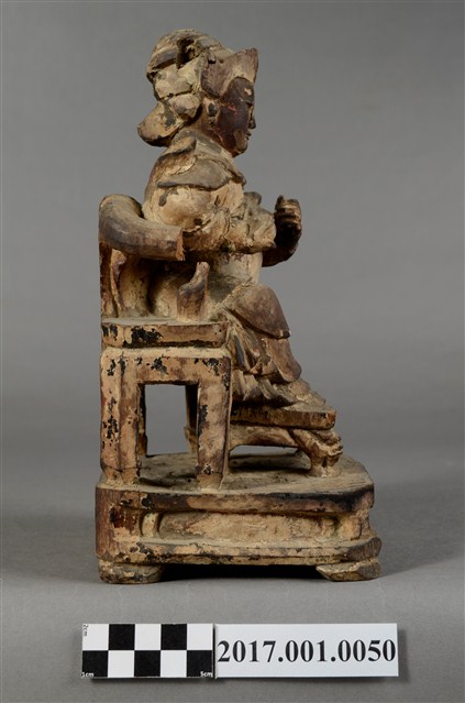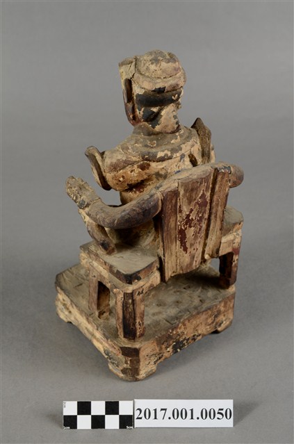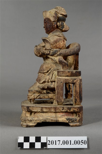 1.本件木雕臨水夫人像,作坐姿姿態,坐於龍頭圈背椅上,表面粧佛已褪去。造像於腦後結髮梳髻,頭戴兜鍪,雙眼垂視,山根塌,上半身著寬袖衣,肩披鎧甲披膊與護肩,下半身著裙,外披鎧甲腿裙,腰部繫束腰固定護腹,腳穿弓鞋。端坐,左手橫置於胸前,右手抬起持物。圈背椅的椅背披坐布,圈背椅的右側出頭缺失,椅前擺放踏几,踏几表現螭虎吞腳。臺座作方臺,表現案几形式。