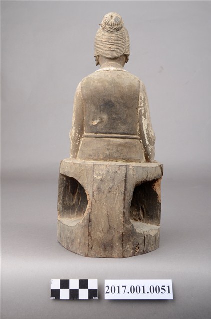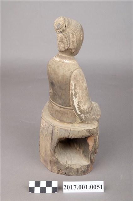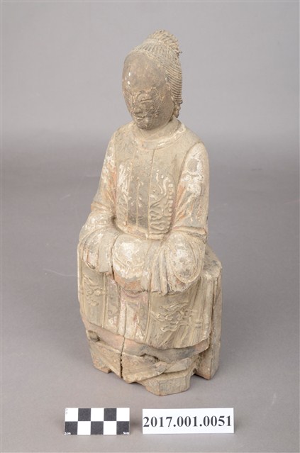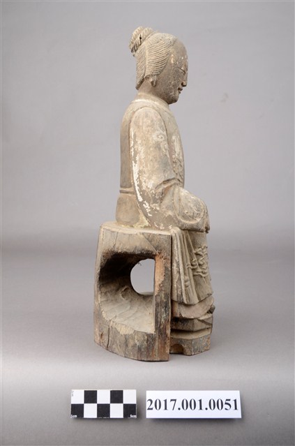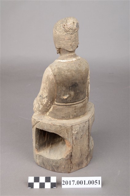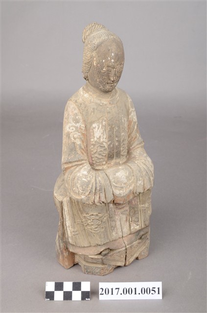 1.本件木雕臨水夫人像採坐姿,表面粧佛已脫落。臨水夫人坐於一無背且後面呈半圓形臺座上,臺座中間鏤空。臨水夫人端坐,腳著弓鞋,足下踏有一小型踏几,踏几上斜披一方巾,臺座前兩端呈斜四角形,中央一道縱裂紋。臨水夫人臉呈鵝蛋臉,臉孔娟秀細緻,面帶慈藹笑容。頭梳一圓高髻,橫插一髮簪,盤髮紋路清晰可見。身著袍服長裙,外罩對襟罩衫,表面有粉線雲紋裝飾,腰間繫有一條細腰帶。雙手交握於腹前,手掌藏於水袖之內。