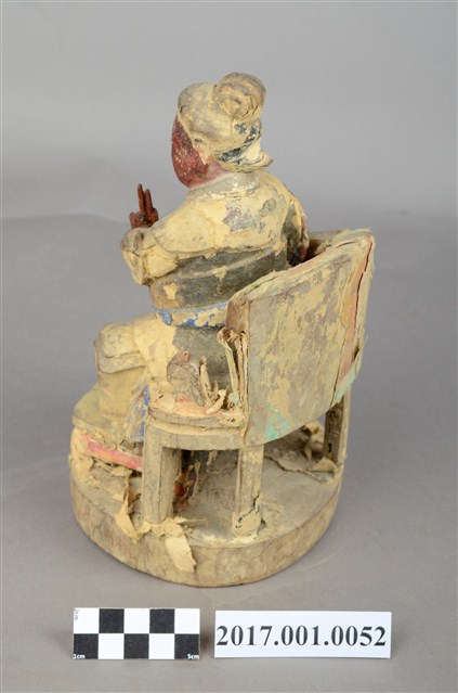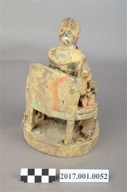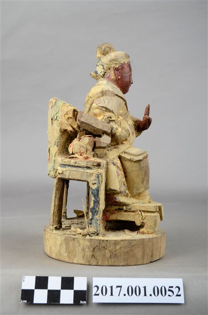 1.本件木雕臨水夫人像,作坐姿姿態,坐於圈背椅上,表面粧佛已褪去。造像於腦後結髮梳髻,頭戴小冠,雙目半睜,山根塌,上半身著寬袖衣,肩披鎧甲披膊與護肩,下半身著裙,外披鎧甲腿裙,腰部繫束腰固定護腹,腳穿弓鞋。端坐,左手伸食指與中指收三指橫置於胸前,右手握拳持物置於右腿。圈背椅椅背披坐布,圈背椅的兩側出頭損毀,椅前擺放踏几。臺座平面呈圓形,無雕刻、粧佛。