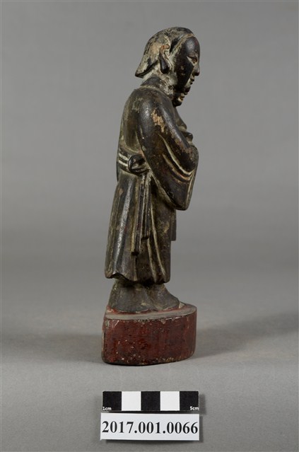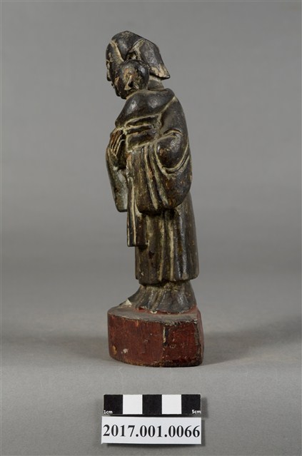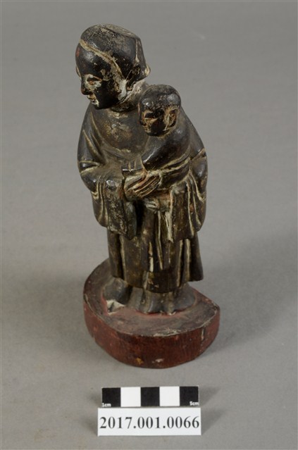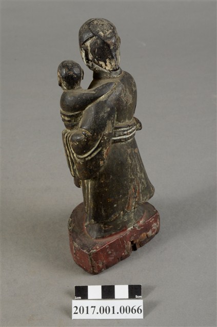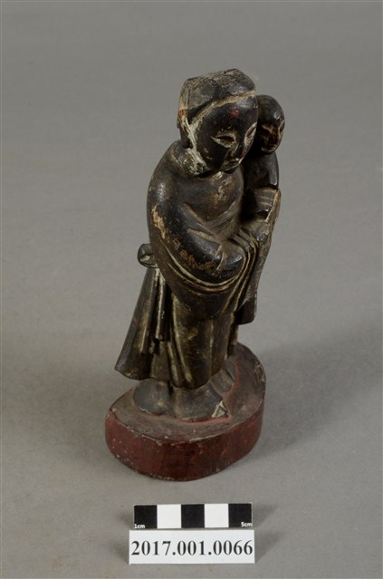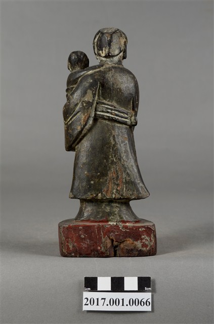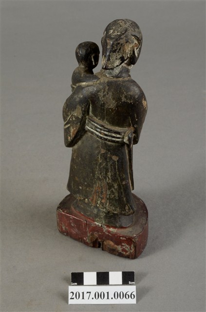 1.本件木雕婆姐像,作立姿姿態,表面施作塗裝粧佛技法。頭部微側向右方,髮梳髻盤於腦後,顏面雙眼垂視,上半身著盤領衣,下半身著裙,雙腳套弓鞋。立像挺身以雙足併攏的姿態站於臺座上,雙手抱著幼童,左手在下捧著幼童臀部,右手扶於孩童身左作護衛狀。
