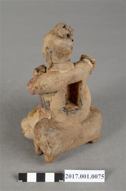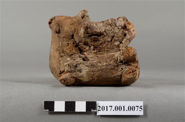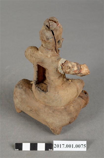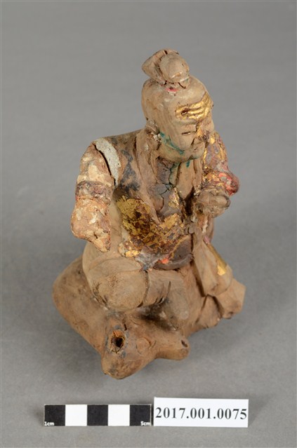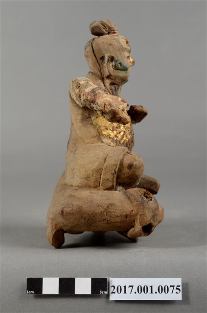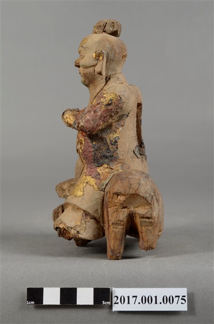 1.本件木雕太上老君像採坐姿,老君橫坐於牛背上,姿態生動,表面粧佛大面積剝落,殘留上額及袍服安金,背後開有長方形入神洞,內部物件已取出,左足及坐騎青牛臀部缺損。老君作老年道人相貌,雙顴凸出,長耳,上額有抬頭紋,嘴下雕及胸長髯。頭戴蓮花道冠,身著窄袖袍服,外罩對襟罩衫,腰間束腰帶,腳著短靴。身軀稍向左傾,左手向前平舉,持一塊狀物,右手右伸虛握,手中持物已失。左腿下垂,右腿屈膝向內縮,擱於牛背上。座下之牛低頭朝左方,角部磨損,四肢缺損。