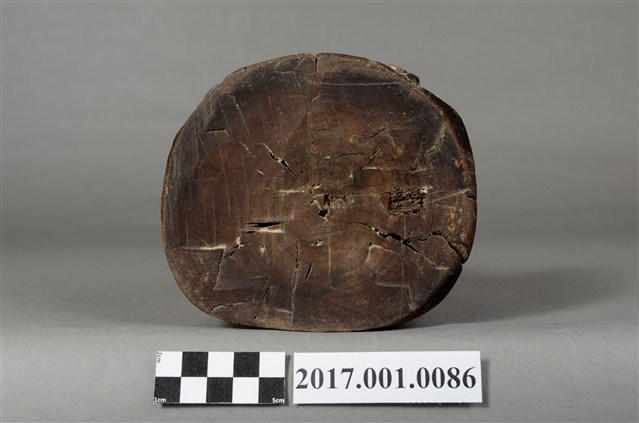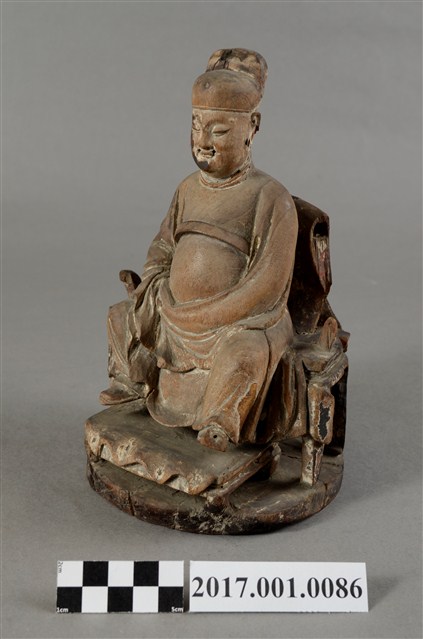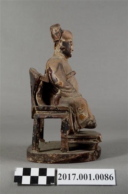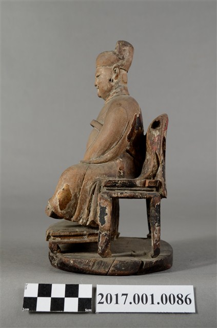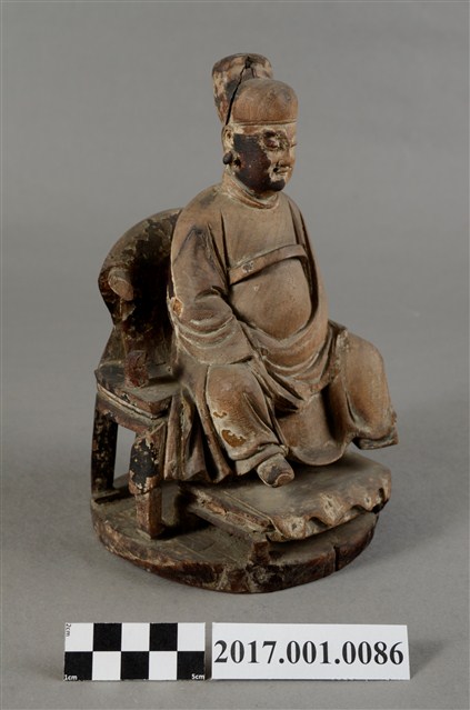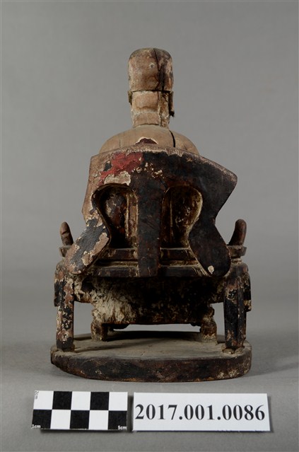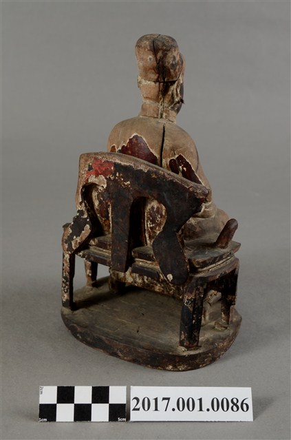 1.本件木雕王爺像,作坐姿姿態,表面粧佛已褪去。顏面表現雙目半睜,鼻翼兩側、下顎、兩頰有植鬚孔,鬍鬚已斷裂脫落。頭戴無翅幞頭,身著寬袖盤領衣,肚腹圓凸,胸前束看帶,腳穿皂靴,端坐於圈背椅上。挺身端坐,雙足自然垂下,左手右伸,雙手藏於衣袖內環抱於腰際,作抱壽(袖)體(通壽體)姿勢,本件雙腳與踏几之間存有空隙,推測原有放置獸座。圈背椅以木雕表現出椅背披著獸皮,圈椅的左右扶手已斷裂缺損,椅前放置踏几。椅下的臺座為圓形,側邊無裝飾。