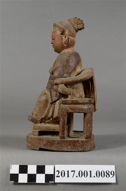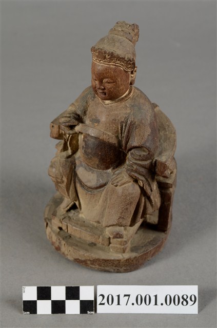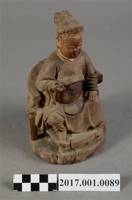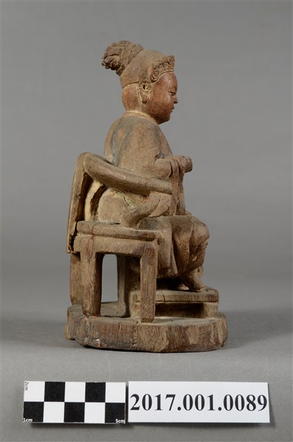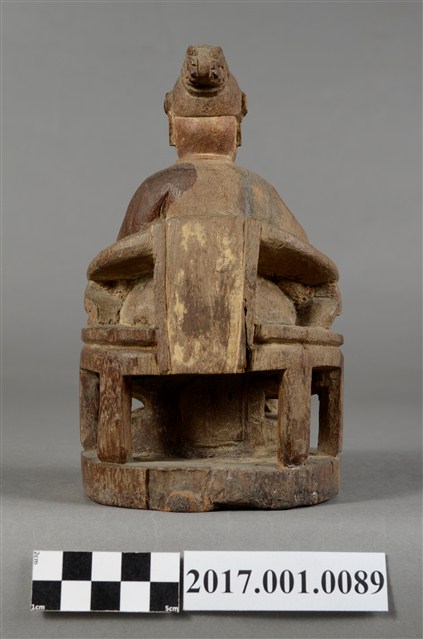 1.本件木雕王爺像採坐姿,端坐於圈背椅上,粧佛已除去。王爺作年輕男子相貌,無鬚,臉頰豐腴,雙眼半睜,長耳,嘴帶笑意。頭戴兜鏊,身穿盤領寬袖長袍,胸前束看帶,腳穿皂靴。左手扶於左膝上,右手小臂上抬握看帶。左腳向左前方伸出,鞋尖翹起,右腳內縮,以鞋尖支地,坐文武腳姿態。圈背椅扶手出頭削落,座前置踏几,臺座作矮圓臺。