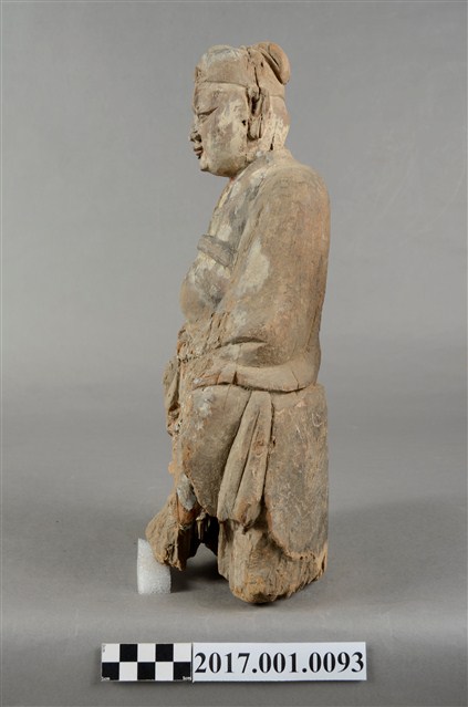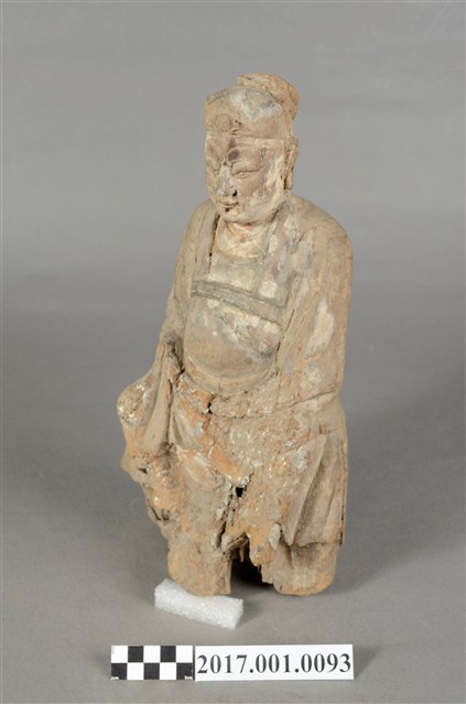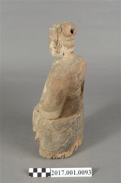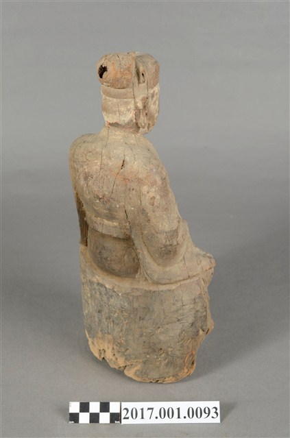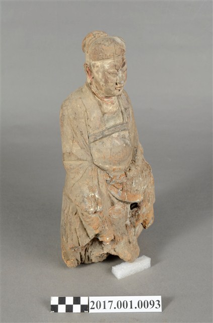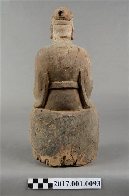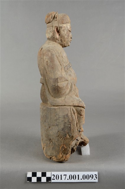 1.本件木雕王爺像,作坐姿姿態,表面粧佛已除去。顏面表現雙目半睜,顏面有植鬚孔,鬍鬚已失。頭戴巾,身著寬袖衣,肚腹圓凸,腰束腰帶,胸前有看帶,腳穿皂靴,端坐於臺座上。挺身端坐,下半身蛀蝕嚴重而無法辨識,左手右伸,雙手藏於衣袖內環抱於腰際,作抱壽(袖)體(通壽體)姿勢。