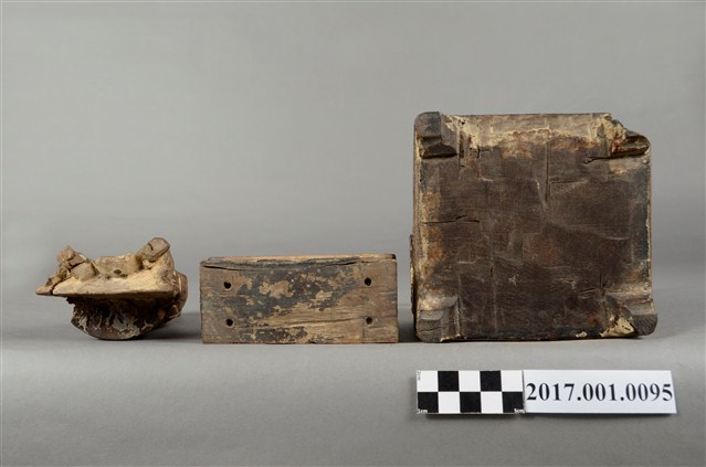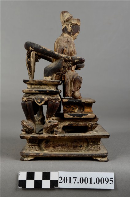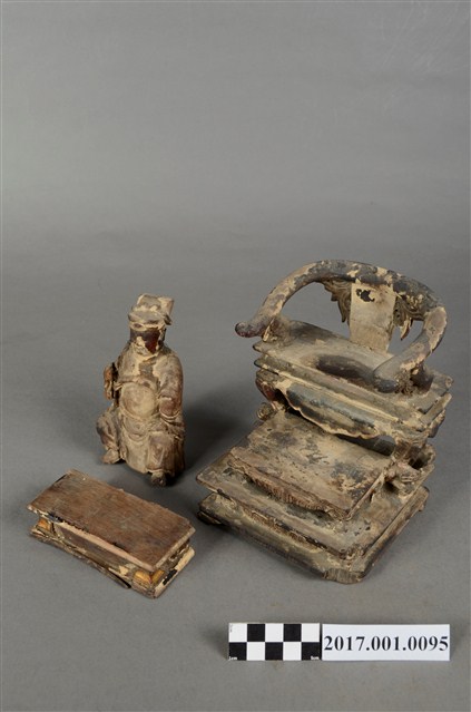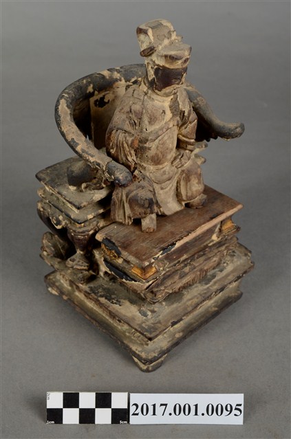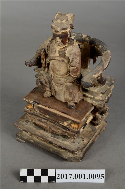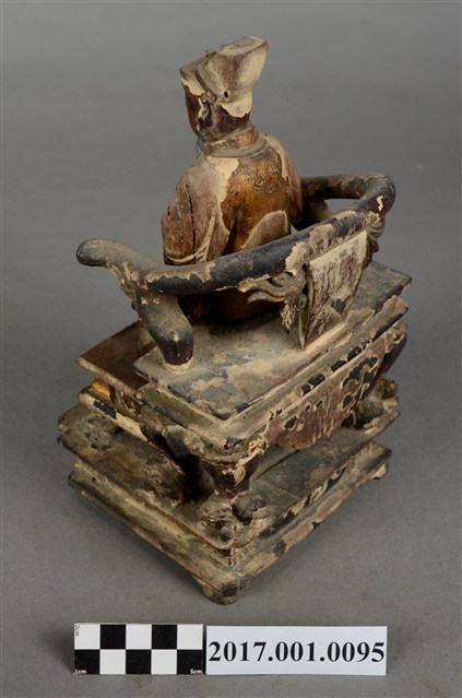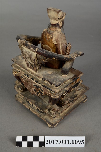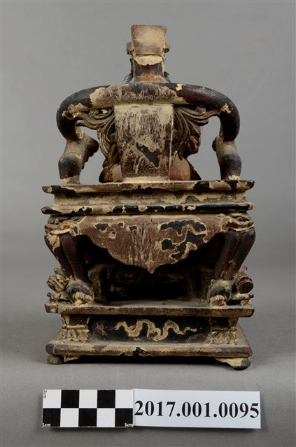 1.本件木雕王爺像,作坐姿姿態,表面粧佛已褪去。顏面表現雙目半睜,鼻翼兩側、下顎、兩頰有植鬚孔,兩頰殘留鬍鬚。頭戴硬殼幞頭,幞頭後有孔,推測原有組裝帽翅,身著寬袖盤領衣,肚腹圓凸,腰繫腰帶,胸上有看帶,腳穿皂靴,坐於圈背椅上。挺身端坐,雙足垂下,左腳向斜前方外推、右腳向內,作「文武腳」坐姿,左手掌放於左腿上,右手握著看帶。本件屬於「脫椅」作法,圈背椅的款式屬於四獸圈背椅,亦即圈椅的四足下有獸座,圈椅的椅背旁雕刻卷草,圈椅的四足雕刻螭虎吞腳,椅前放置踏几。椅下的臺座為案几形式,臺座的堵頭雕刻蓮花紋,臺座一角損毀。