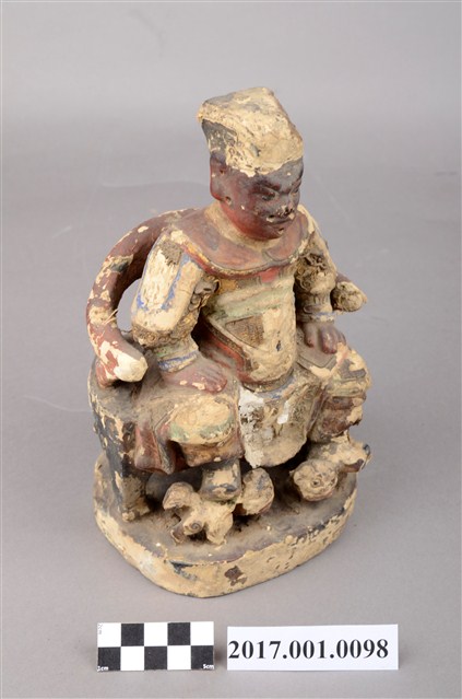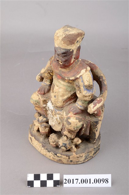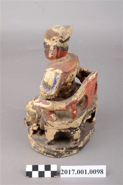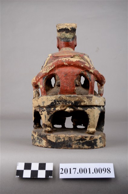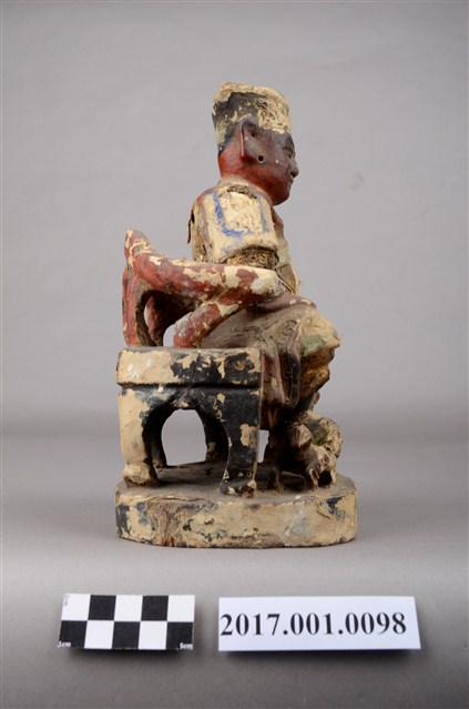 1.本件木雕王爺像採坐姿,端坐於紅色圈背椅之上。表面施以漆線安金技法飾成,粧佛部分剝落並以補土填補,填補部分略有破損,背後有圓形入神洞,封榫邊緣破損。王爺臉色絳紅,皺眉,雙目瞠視,表情威嚴,嘴部有植鬚孔。頭戴幞頭,帽前緣剝落,身穿甲袍,腰束革帶,甲袍飾以粉雕表現,腳穿皂靴。左右手扶於膝上,左腳向左微伸,右腳內縮,作文武腳姿態,踩獸座。臺座作矮方臺。
