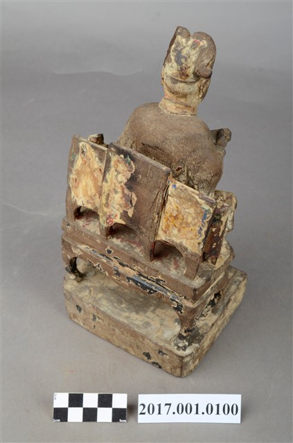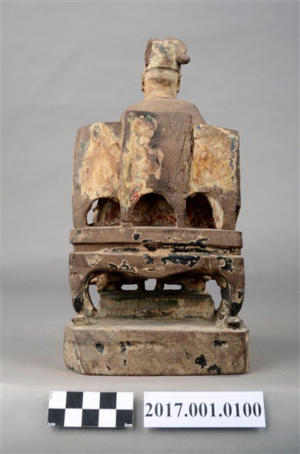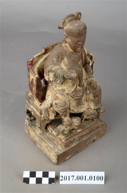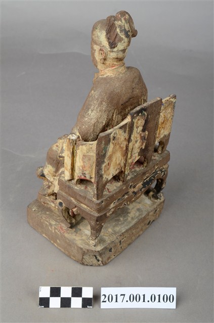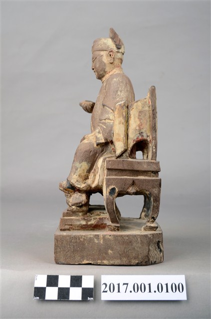 1.本件木雕王爺像,作坐姿姿態,坐於屏椅上,表面粧佛已褪去。臉型輪廓橢圓,雙眼半睜,表現年輕男性的相貌。頭戴翼善冠,身著盤領衣,上半身套短掛,腳穿皂靴。挺身端坐,雙足垂下,兩腳各蹬獸座,右腳露出盤領衣內的長褲,左手掌向下置於腿上,右手掌向上持書冊。屏椅前有踏几。椅下的臺座呈方形。