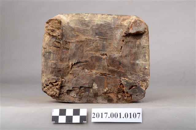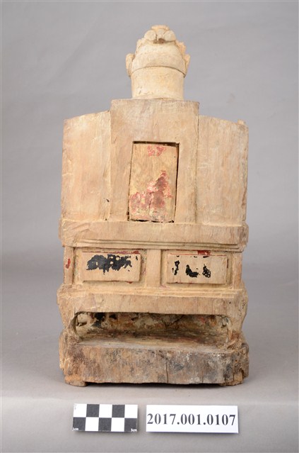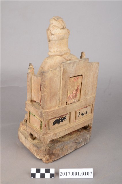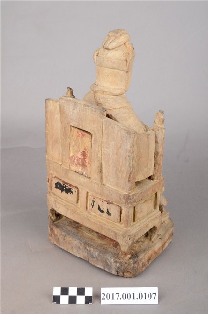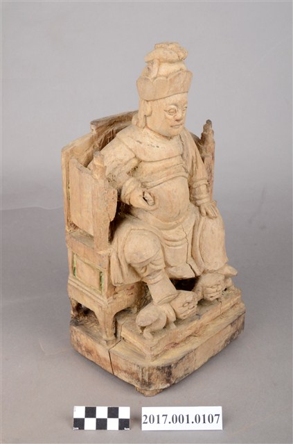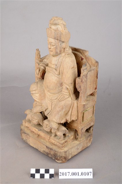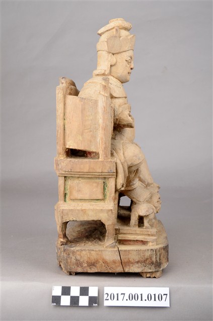 1.本件木雕王爺像採坐姿,端坐圈背椅上,粧佛已除去,神像背後有方形入神洞,封榫尚存。王爺作年輕男子相貌,無鬚,臉頰豐腴有肉,高鼻大眼。頭戴兜鏊,身穿甲袍,腰束腰帶,胸前有看帶,腳穿皂靴,足踏獸座。左手手掌朝前扶於左膝,右手持物,持物模糊不清,左腳微向左伸,右腳內縮,作文武腳姿態,座前置踏几。臺座作四足矮方臺。