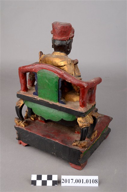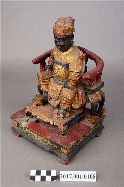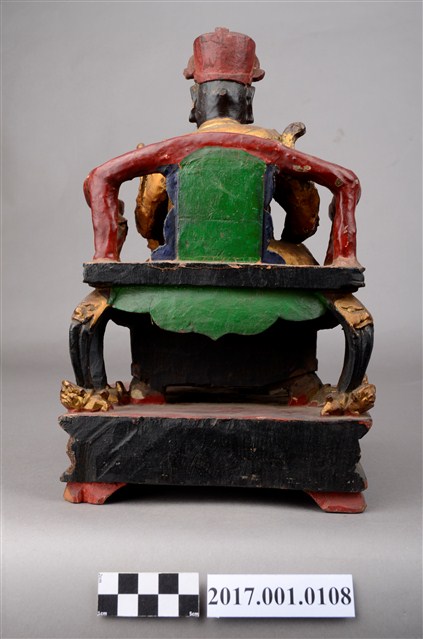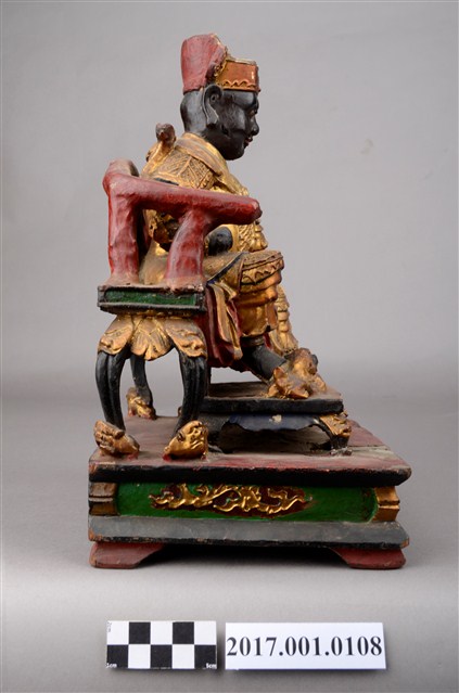 1.本件木雕王爺像採坐姿,端坐於綠色圈背椅之上,表面施以粉雕安金工法飾成。王爺作中年男子相貌,臉色黝黑,嘴邊有植鬚孔,留有部分黑鬚,皺眉,雙目凸出,鼻頭顴骨凸起,面帶笑意。頭戴漆線裝飾之幞頭帽,身穿甲袍,甲袍以粉雕鎧甲鱗片等紋,腳穿皂靴踩獸座。左手襬放於左膝上,右手握拳置於右膝。左腳微向左伸出,右腳內縮以腳尖支地,作文武腳姿態。圈背椅椅背綠色,扶手紅色,椅腳黑色,底部飾有獸座,前置有踏几飾以獸座。臺座作四足束腰矮方臺,正面飾有花草紋,臺座前方有破洞,有補土修補痕跡。