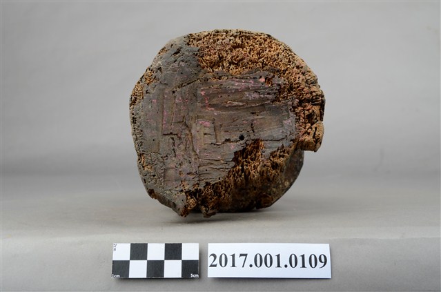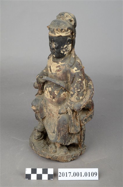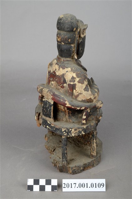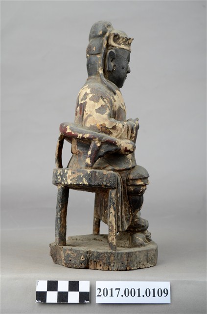 1.本件木雕王爺像採坐姿,端坐圈背椅上,粧佛大部分剝落。王爺作中年男子相貌,臉色黝黑,臉頰豐腴,雙眼凸出,皺眉瞠視。王爺頭戴兜鏊,帽帶披於肩上,身穿圈領寬袖長袍,胸前有看帶,腳穿皂靴踩獸座。左手扶於左膝上,右手托看帶,左腳微向左伸,右腳內縮,作文武腳姿態。神像背後圈背椅有蟲蛀痕跡,右後方底座斷裂脫落。臺座作矮圓臺。