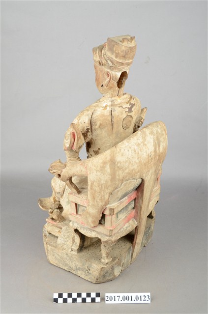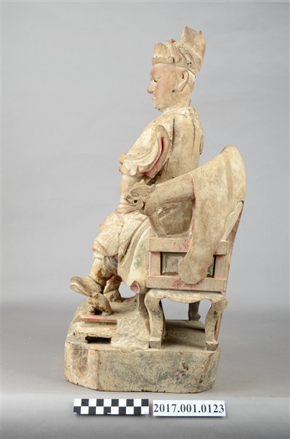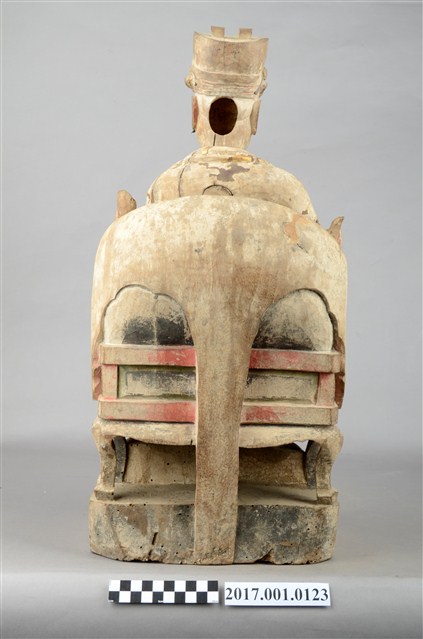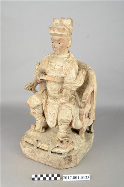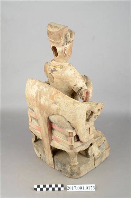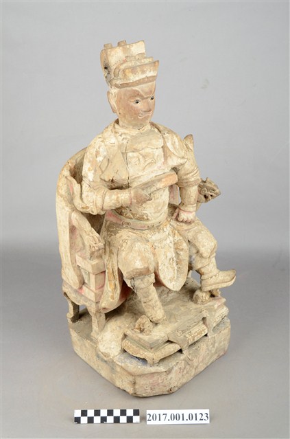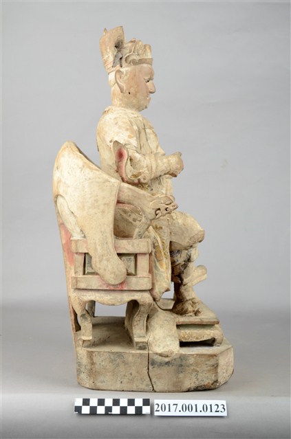 1.本件木雕王爺像採坐姿,端坐圈背椅之上,粧佛已除去,腦後及背部開有圓形入神洞,其中腦後入神物為塑膠管包覆紅紙,尚未取出,背部入神洞則封榫尚存。王爺作中年男子相貌,嘴部有植鬚孔,雙眼鑲嵌玻璃珠,皺眉,雙目瞠視,鼻頭凸出,抿嘴。王爺頭戴幞頭,身穿甲袍,身體部分有補土痕跡,雙腳穿皂靴踏獸座。右手持看帶,左手握拳置於左膝上,左腳向左伸出,右腳內縮以足尖支地,作文武腳姿態。圈背椅扶手出頭飾有龍頭,前置踏几。臺座作高方臺。