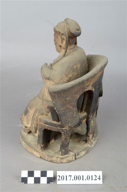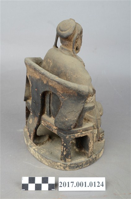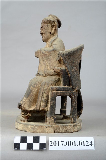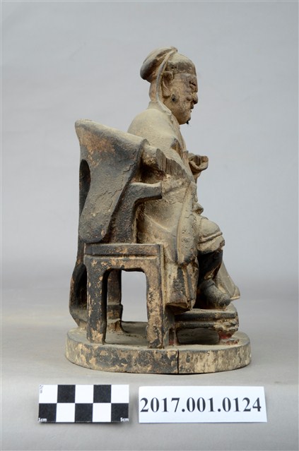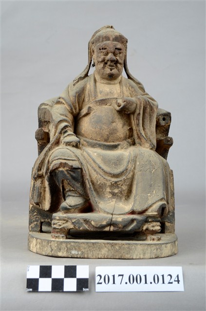 1.本件木雕王爺像採坐姿,端坐圈背椅上,粧佛已除去。王爺作中年男子相貌,濃眉大眼,鼻頭與顴骨凸起,面帶微笑,嘴部有植鬚孔。王爺頭戴頭巾,身穿甲袍,腹部束腰帶,胸前有看帶,腳穿皂靴。左手抬持看帶,看帶部分斷裂,右手握拳置於右膝上,左足微向左伸出,前端削落露出孔,右腳內縮,作文武腳姿態。圈背椅飾有虎皮,顏色除去不清,前置踏几飾以獸座。圈背椅兩側扶手出頭斷裂。臺座作矮圓方臺。