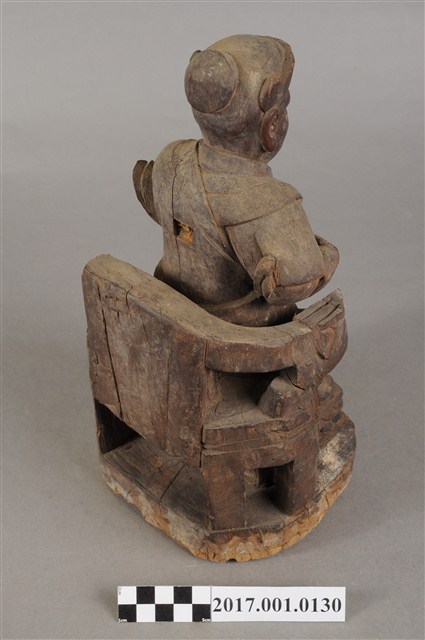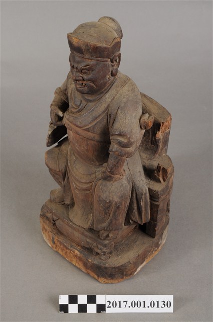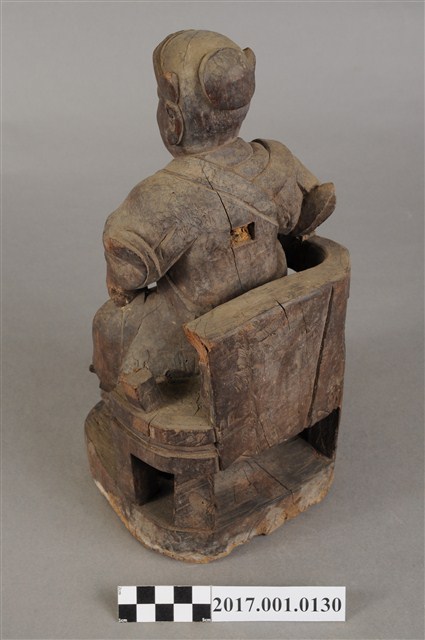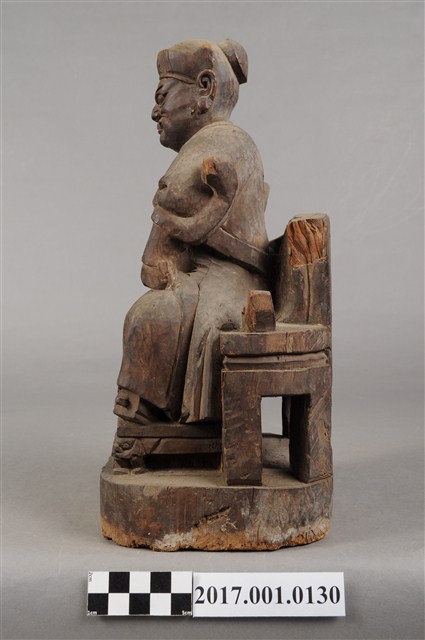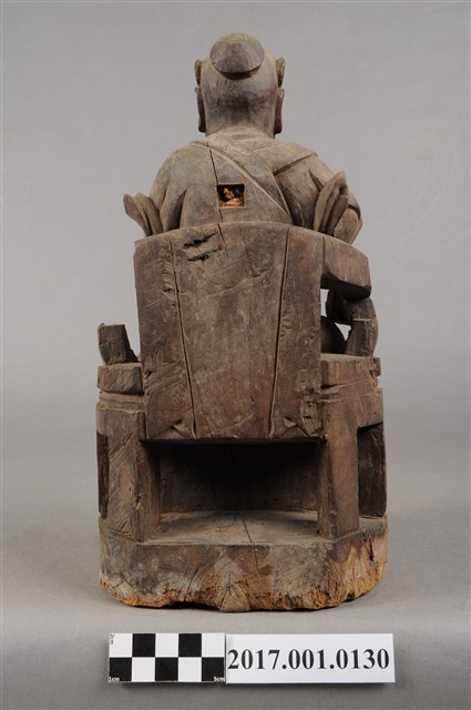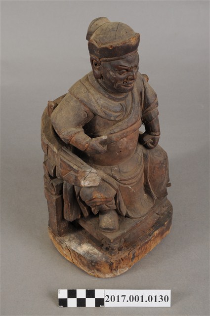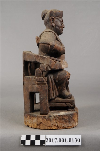 1.本件木雕王爺像採坐姿,端坐於圈背椅上,粧佛已除去,背部開有方形小入神洞,封榫佚失。王爺作中年男子相貌,嘴部有植鬚孔,皺眉,濃眉大眼,雙眼瞠視,鼻頭與顴骨凸起,抿嘴。王爺頭戴兜鏊,身穿甲袍,右手持看帶,左手握拳置於左膝,左腳微向左伸出,右腳內縮,作文武腳姿態,腳穿皂靴踩踏几。圈背椅前置踏几,踏几雕刻螭虎吞腳,圈背椅的扶手斷裂。臺座作矮方臺。