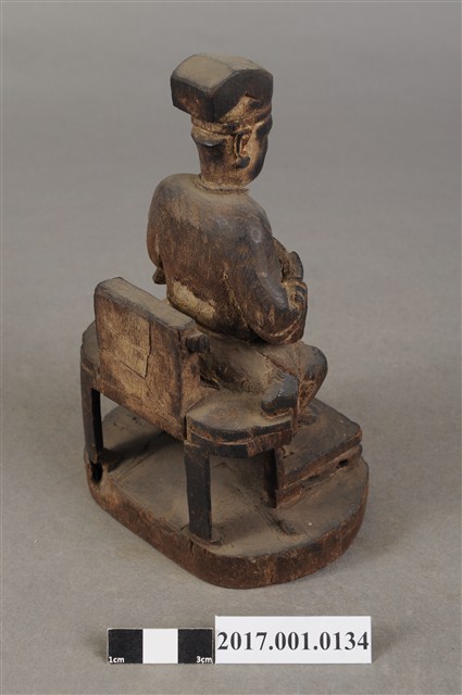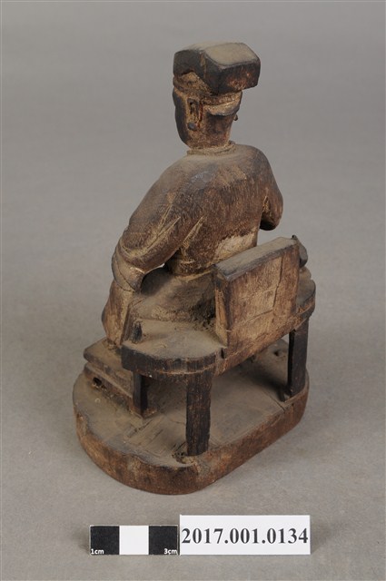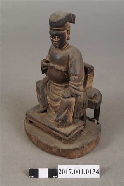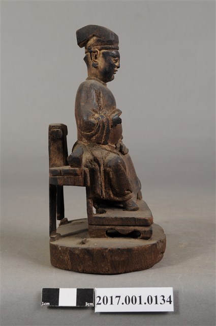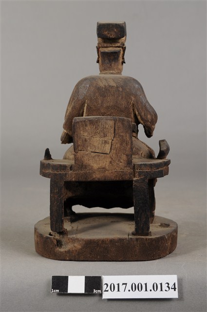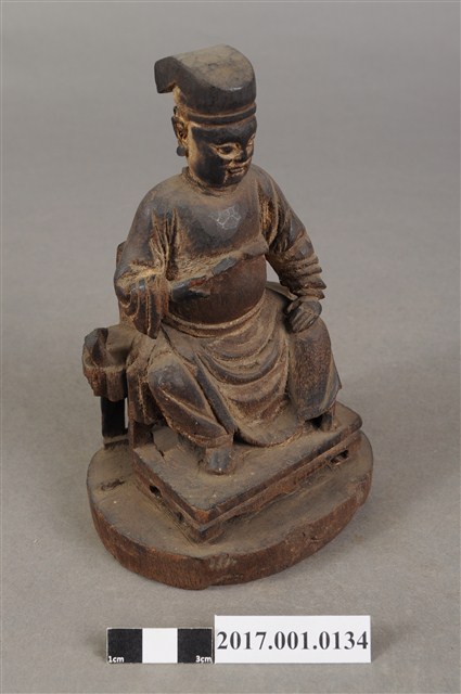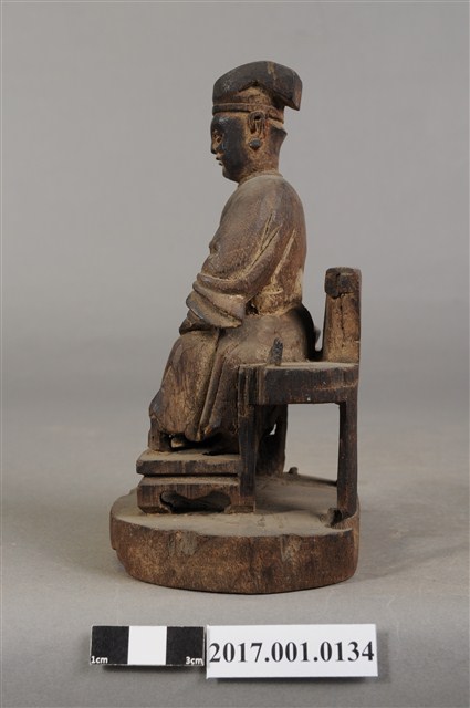 1.本件木雕王爺像,作坐姿姿態,表面粧佛已褪去。臉型輪廓呈現矩形,瞠目。頭戴圓巾,身著窄袖盤領衣,肚腹圓凸,腹下束腰帶,胸前有看帶,腳穿皂靴,坐於圈背椅上。挺身端坐,雙足垂下,左腳向斜前方外推、右腳向內,作「文武腳」坐姿,左腳損毀,左手掌向下置於腿上,右手掌向上握著看帶。圈背椅的椅背披坐布,圈背椅扶手損毀,椅前有踏几,椅下臺座呈圓形。