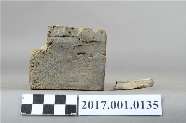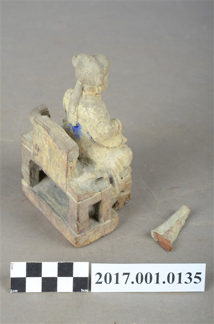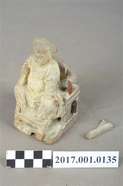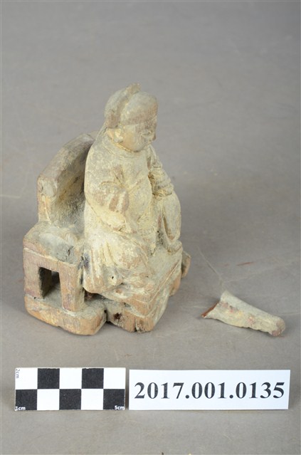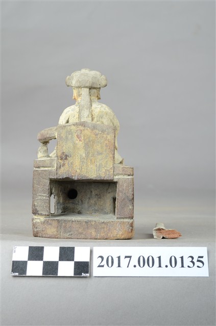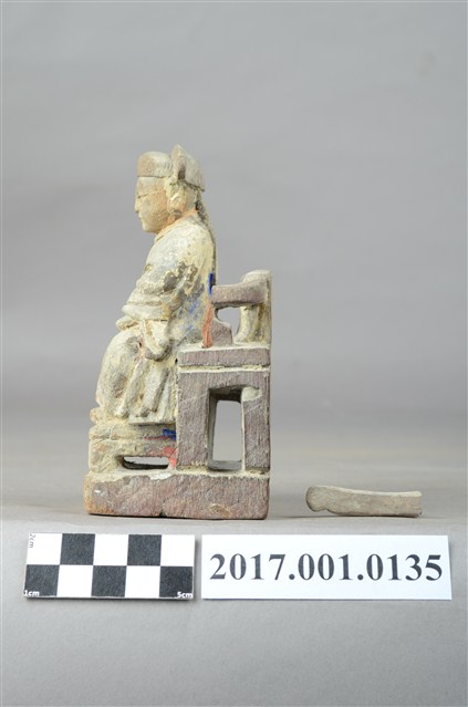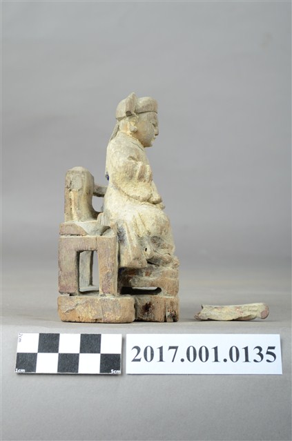 1.本件木雕王爺像,作坐姿姿態,表面粧佛已褪去。臉型輪廓圓潤,雙眼半睜。頭戴文生巾,身著盤領衣,肚腹圓凸,胸前束看帶,腳穿皂靴,坐於圈背椅上。挺身端坐,雙足垂下,左手掌握拳向下置於腿上,右手舉起,右手掌削除。圈背椅的椅背披坐布,圈背椅的扶手損毀,椅前有踏几,椅下臺座平面呈凸字形。