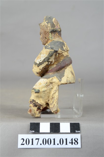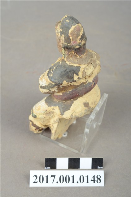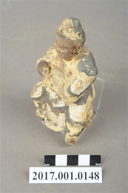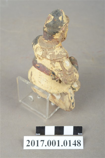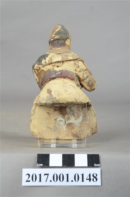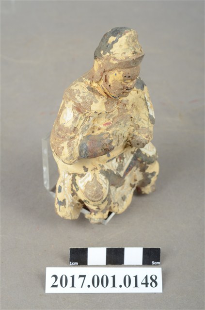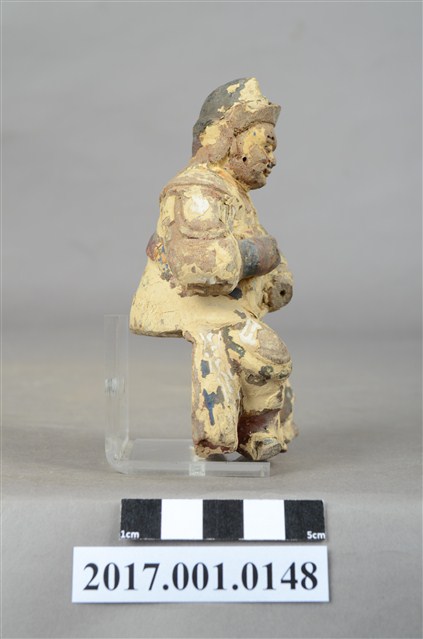 1.本件木雕王爺像採坐姿,採脫椅技法,表面飾以粉雕安金彩繪技法,粧佛大部分脫落,神像背部有方形入神洞,封榫尚存。王爺作中年男子相貌,嘴部有植鬚孔,臉頰豐腴,雙眼圓睜,嘴帶笑意。頭戴兜鏊,身穿甲袍,胸前粧佛模糊不清,其餘鎧甲線條可辨,腳穿皂靴。左臂置於胸前,手掌削落,右手小臂上抬握看帶,手指部分斷裂,看帶模糊不清。左腳向左前方伸出,右腳內縮,足部削去。