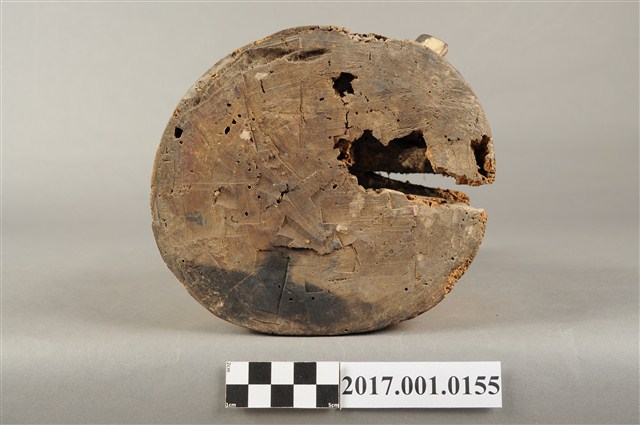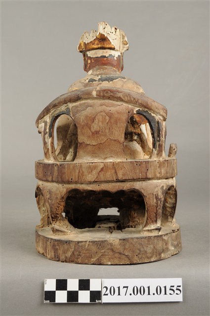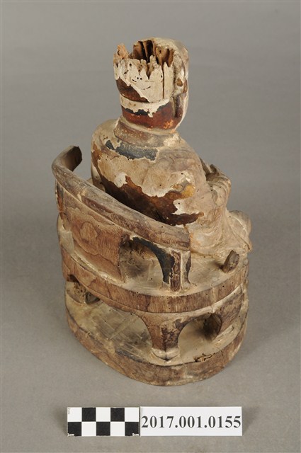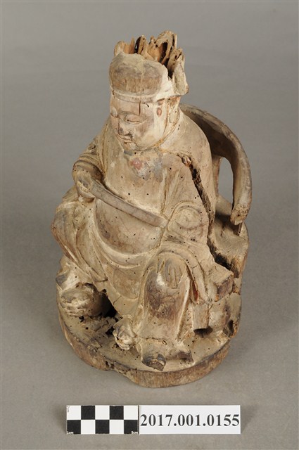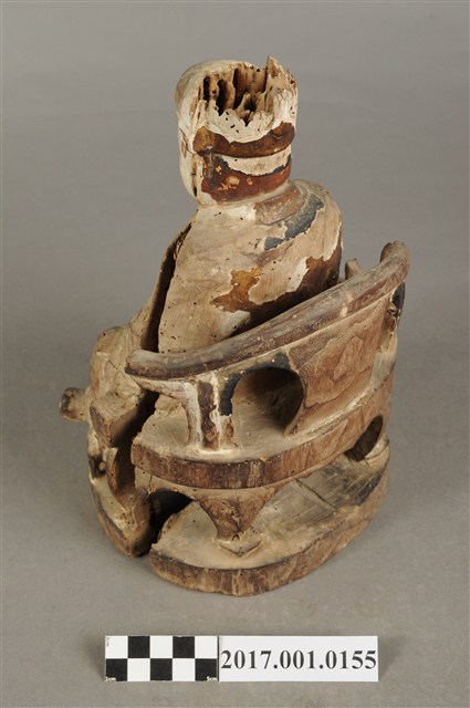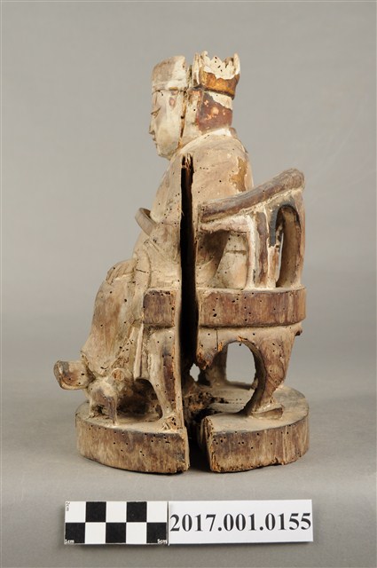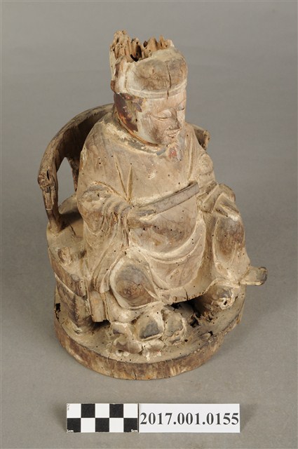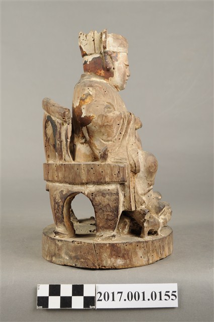 1.本件木雕王爺像採坐姿,王爺端坐於圈背椅上,表面粧佛已除去,鬍鬚脫落,冠之後端破損,座椅扶手缺損,通身分佈有小蛀蝕孔。王爺像作中年男子相貌,嘴部上下方分別有兩處及一處小孔作為植鬍鬚處,頭戴翼善冠,身著圓領袍服,腹部束有腰帶。左手扶於左膝之上,右手小臂上舉握胸前之看帶。雙腳各踏於獅子背上,腳下對獅頭部朝中央,左腿略為前伸,臺座作矮圓臺。