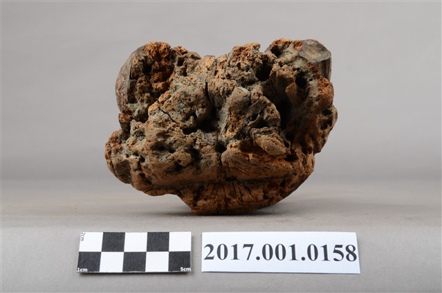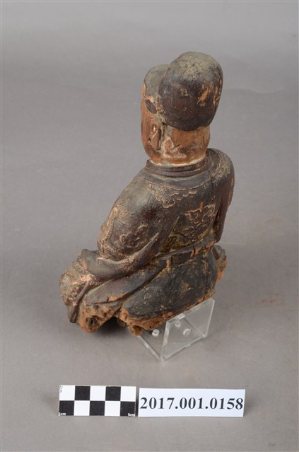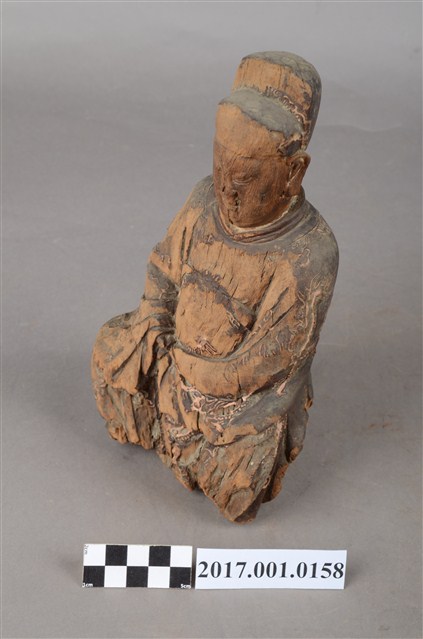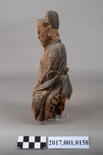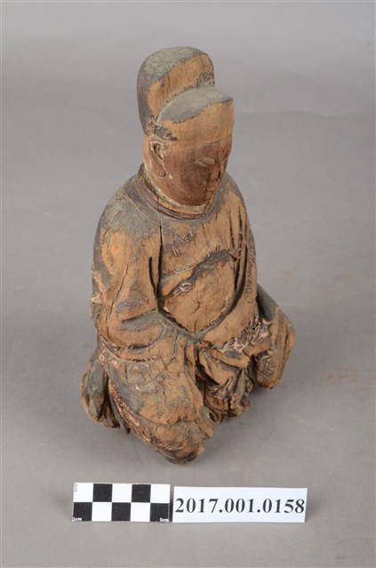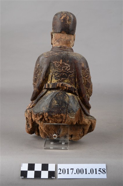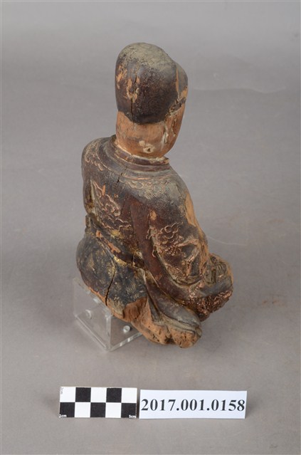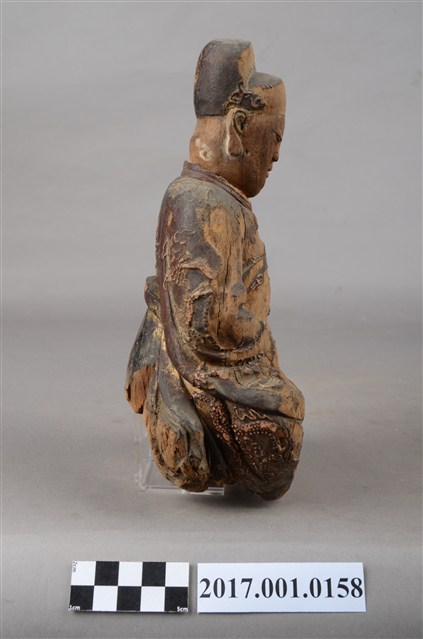 1.本件木雕王爺像採坐姿,臺座已失,表面粧佛已褪去,鼻部及下頷有裂紋,鬍鬚已脫落,底部蛀蝕,粧佛尚存。王爺像作中年男子相貌,嘴部上下方分別有兩處及一處小孔作為植鬍鬚處,頭戴圓巾,身著圓領袍服,腹部束有腰帶。右手下垂左手右伸,兩手交握隱於袖內,為抱壽(袖)體,雙腳足部缺損。