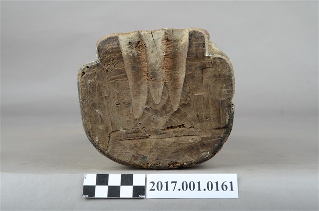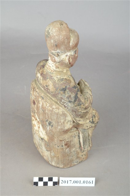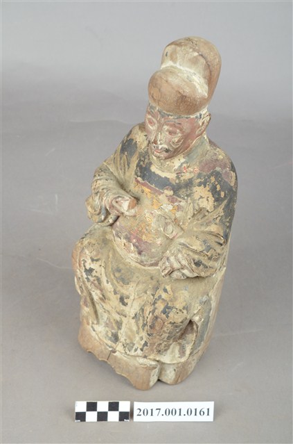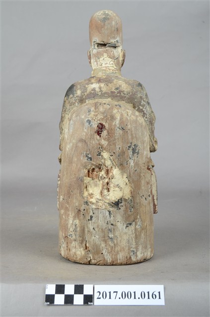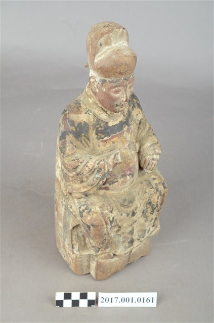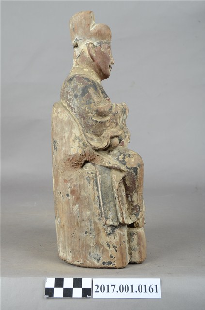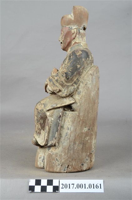 1.本件木雕王爺像採坐姿,端坐於圈背椅上,表面粧佛呈現大面積剝落,鬍鬚脫落,胸前看帶斷裂缺損。王爺像作中年男子相貌,臉部修長,絳紅臉色,嘴部上下方分別有小孔作為植鬍鬚處,周邊並塗繪黑色,雙眼及嘴唇留有朱紅色。頭戴幞頭,身著圓領袍服,腹部束有看帶。左手扶於左側扶手上,右手小臂上舉握胸前之看帶,雙足踏於座前踏几上,左足鞋間翹起,右足鞋尖磨損。