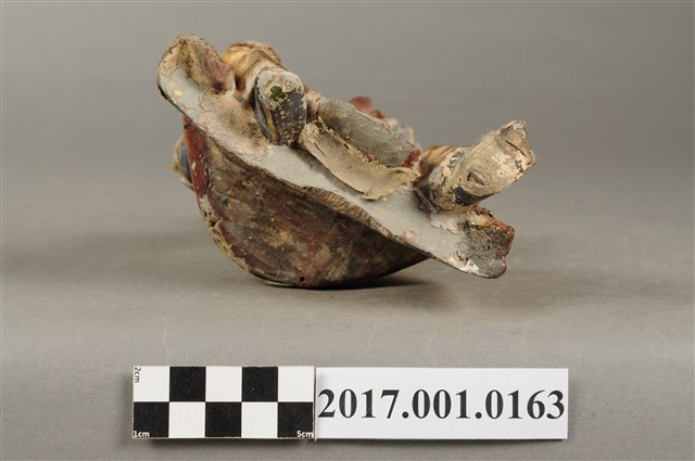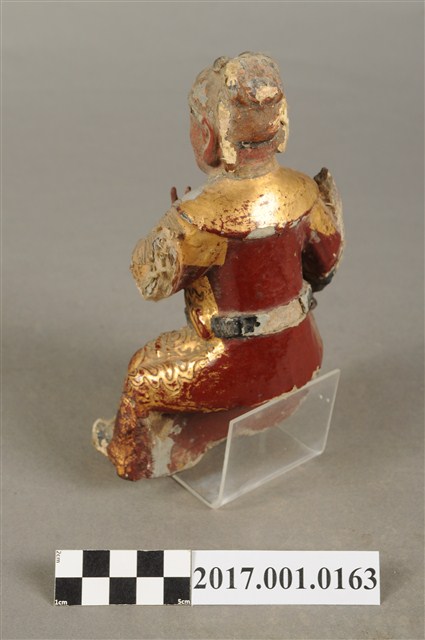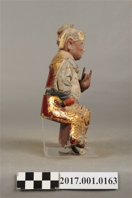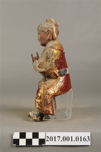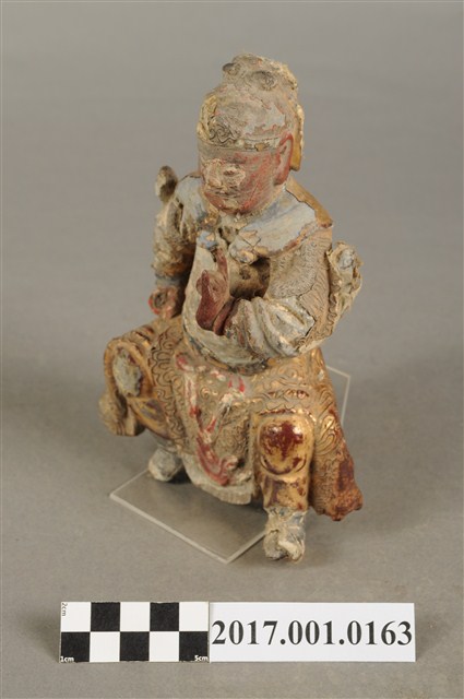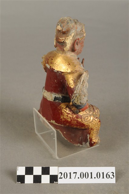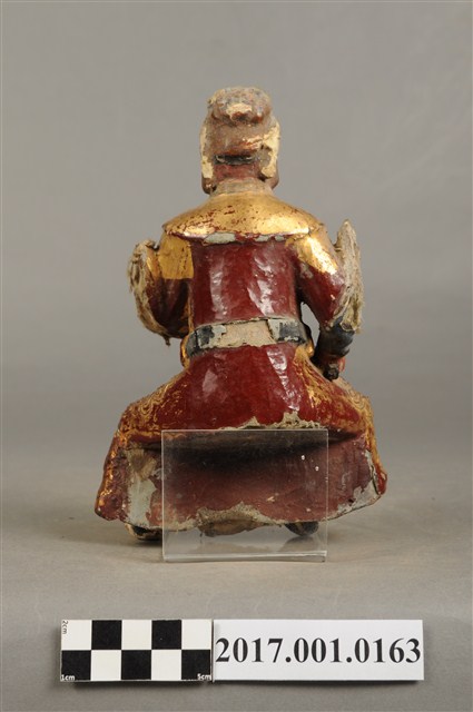 1.本件木雕王爺像採坐姿,為脫椅技法,表面施以粉雕彩繪安金工法,正面粧佛大部分脫落。王爺做年輕男子相貌,無鬚,臉色紅潤,臉頰豐腴,雙目半睜,鼻頭凸出,鼻頭彩繪剝落。頭戴頭巾,身著甲袍,袍服粉雕盤飾鎧甲、花卉、雲朵等紋,腰繫玉帶,腳穿皂靴。左手橫伸於胸前,以拇指按中指和無名指作道指訣,右手握拳置於右膝,手中持物遺失。左腳向前伸出,足跟支地,右腳內縮,作文武腳姿態。神像臀下貼有一張四邊破碎之標籤紙,以黑原子筆書寫「300□□」。